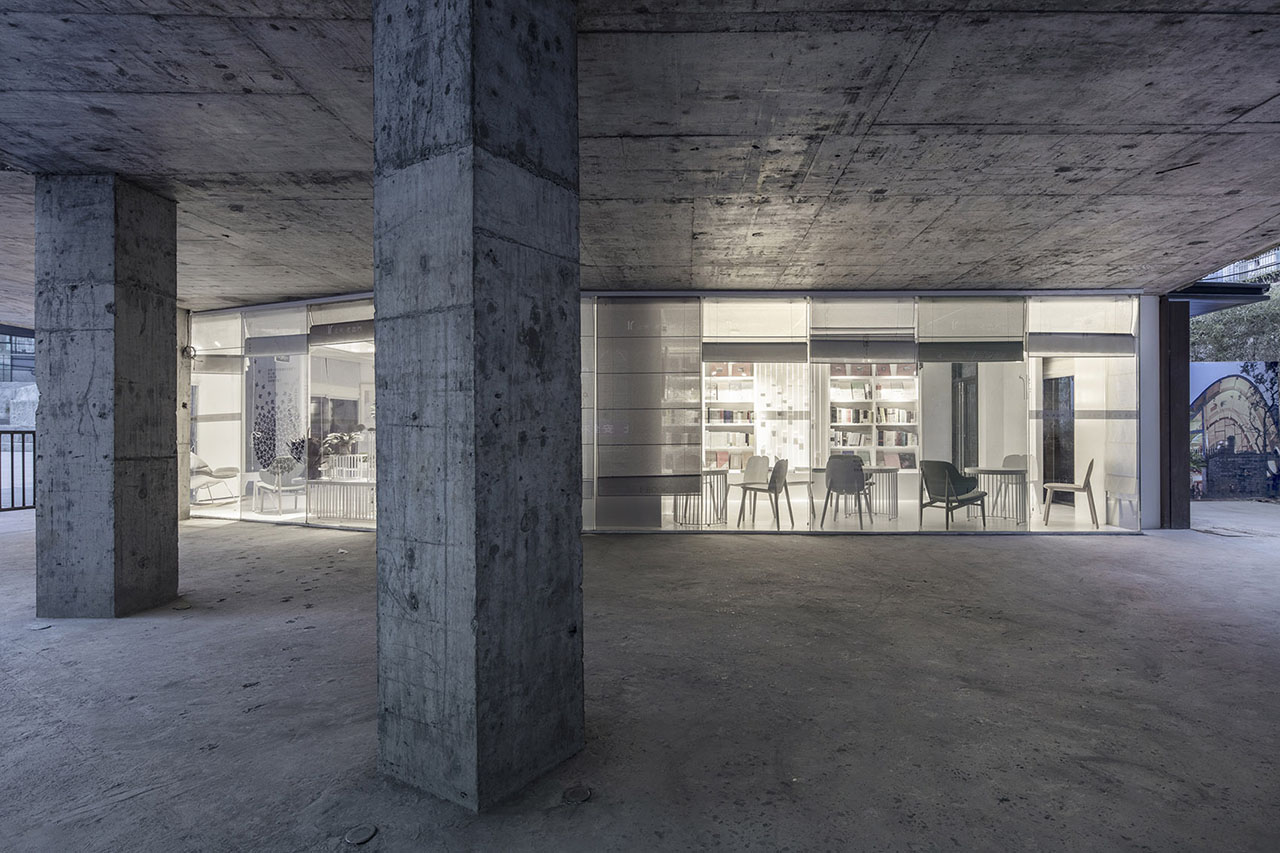 离书店前坪20米,有保留下来一处常德会战碉堡遗址。遗址是纯混凝土结构,而书店建筑形态有呼应之意,也是混凝土建筑外型,所以建筑外观我们做的最大改造是尽量不做任何改造,而是保留着二者共同的厚重肌理。不做任何外墙材料的装饰,只是拆掉原一楼的标准化商铺铝合金门窗,改成大面积无框玻璃,以厚重来衬托书店所需的白和纯净。