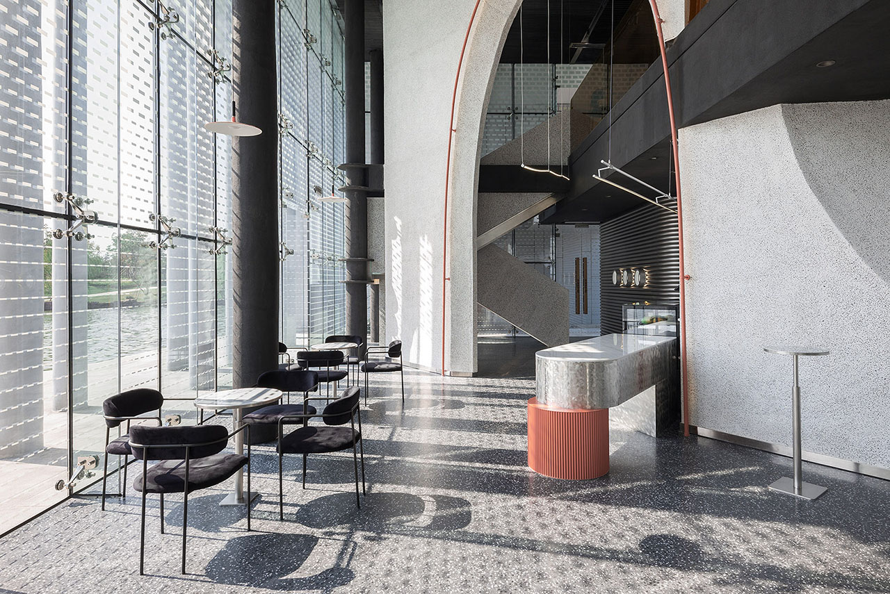 项目是坐落湖边的新时沏品牌master店,建筑本体简约利落,外围条件优越。
