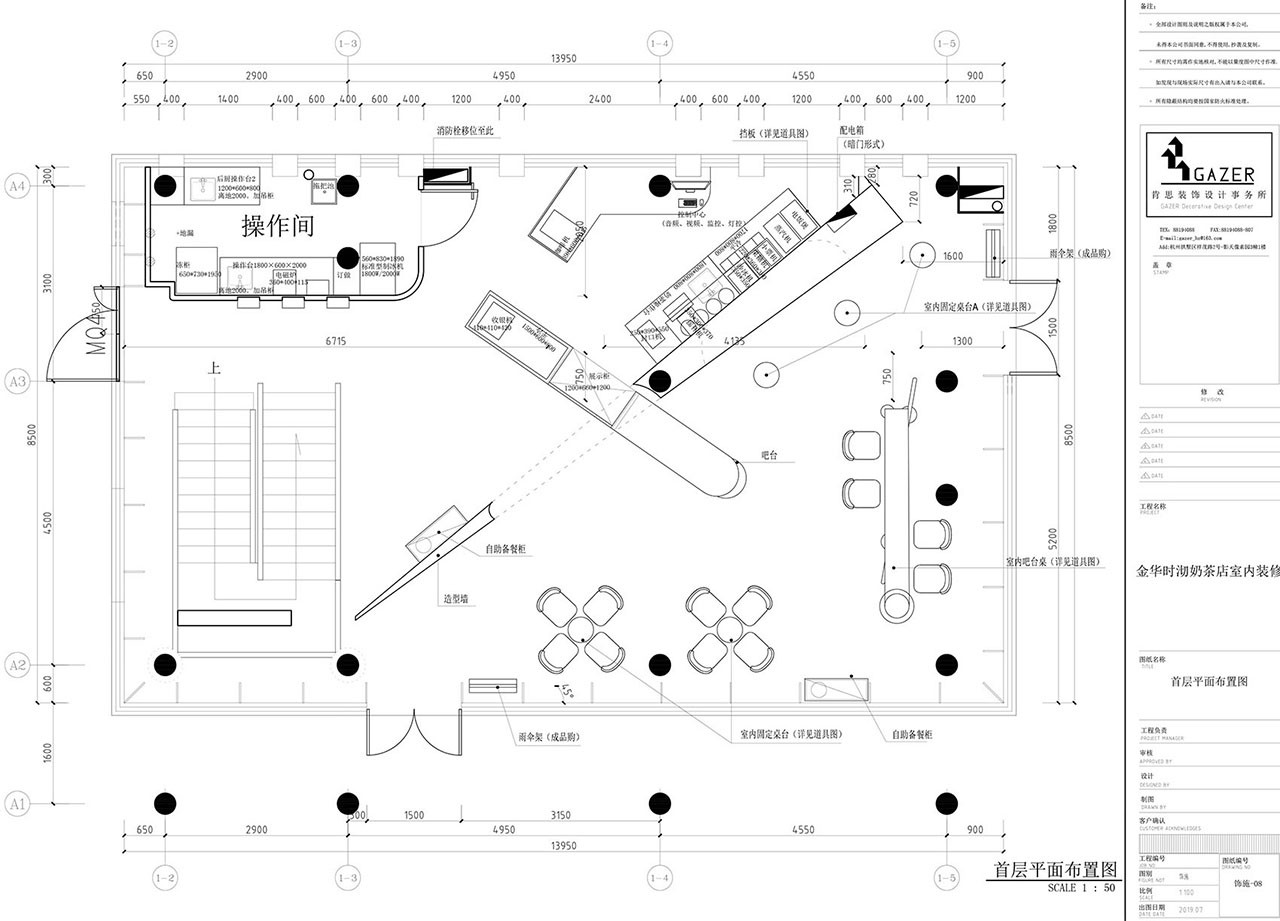 景致和光线在同一时间轴上呈现不同的画面感:阳光与内景、热情与冷静、开放与紧致、社交与艺术等等双重空间表达。且两个界面并非孤立,通过孔洞式的造型达成空间对话,穿插于其中的灯带及吧台链接内外关系,制造虫洞般的联想。新时沏品牌有着“sometimes”的延伸含义,沏泡的不止是饮品而是放慢的时光。设计团队运用水洗石和乱纹不锈钢制造这一层意境,原创的长桌将日出日落的具象透过渐变玻璃形成幻象。