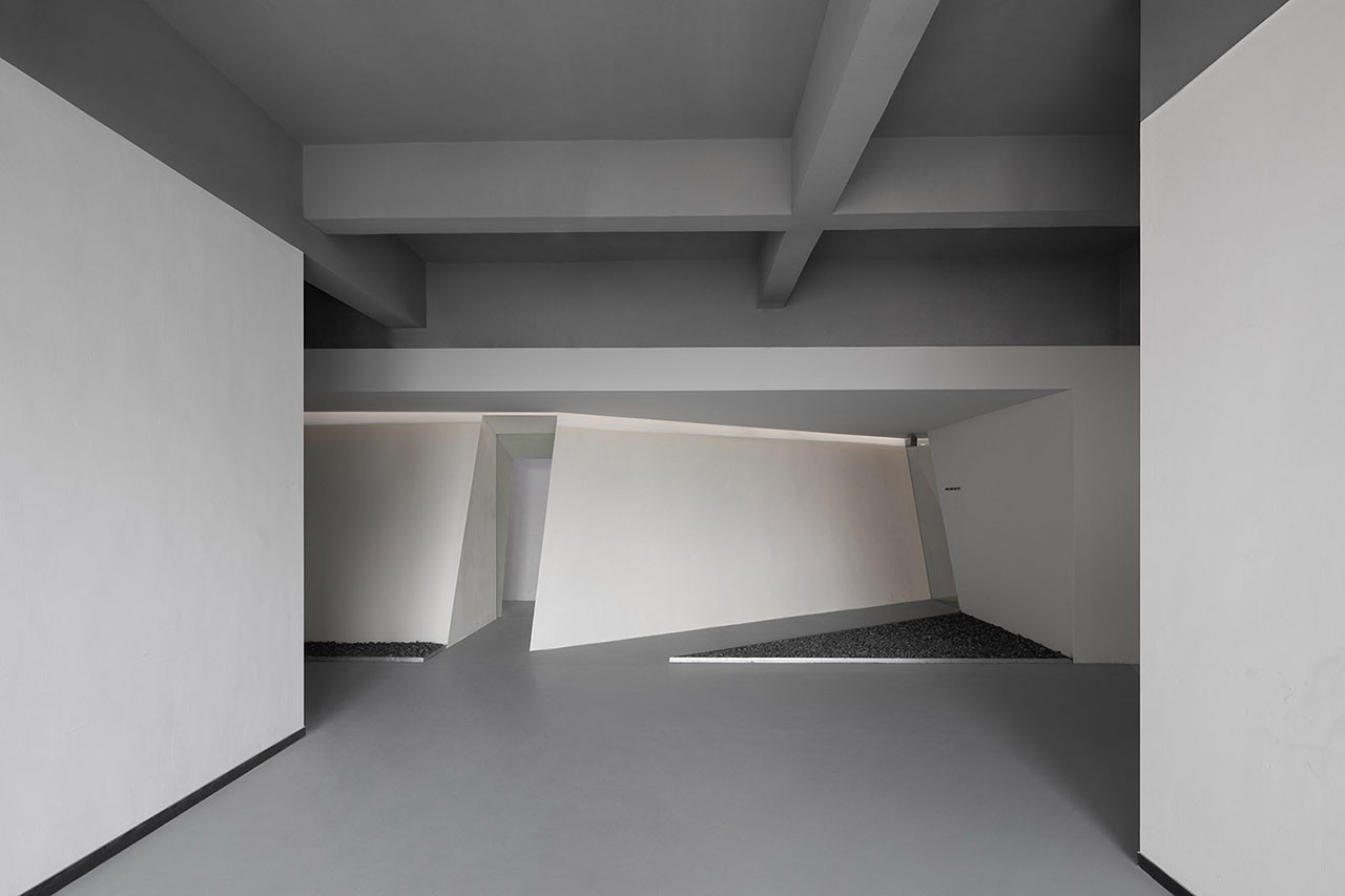 展厅空间因为入口平面格局的变化变成了不规则长条形的空间,我们在这样的空间在希望能寻找到用力量的点,所以我们在入口处设置了一个高于吊顶面的巨大棱锥体,仿佛是天井投射下来的光线凝结而成,由上而下的明暗渐变将光影之美展现得淋漓尽致。当然视觉上还有“挡”的屏风作用。大量留白设计,都是为了彰显不设限与雕饰,不拘束于规则。