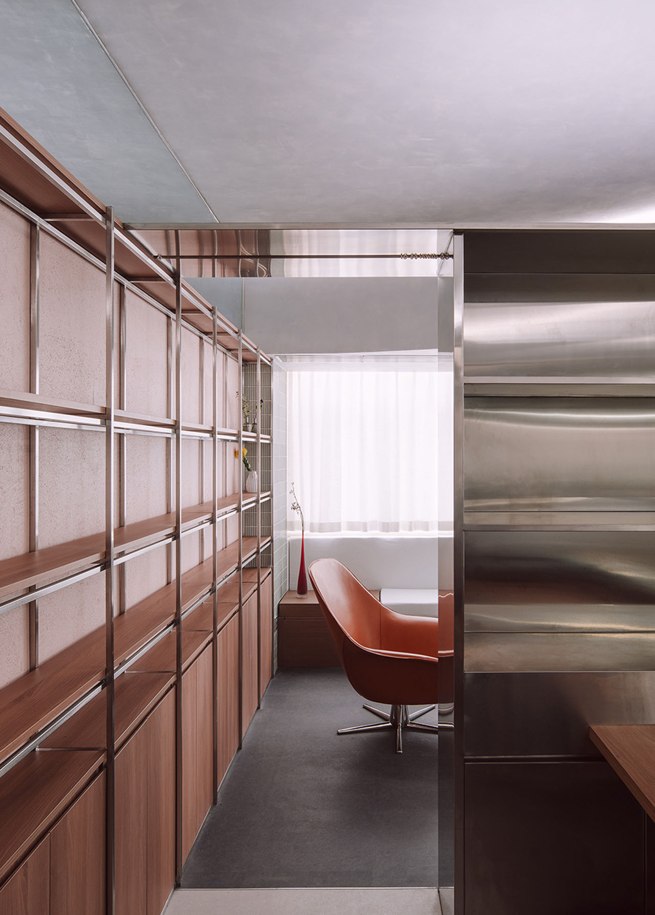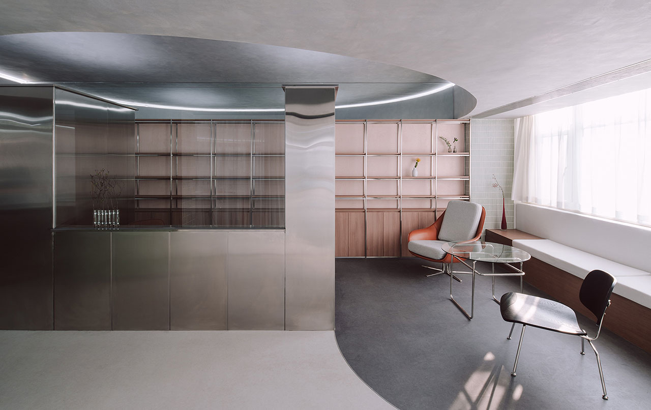 辅助的区域形成一个长向的空间,引导顾客进入。我们在天花上延续圆形的语言,通过层架上的镜子使空间在视觉上得以延展。固定的柜体划分出,前台,工作桌等较为私人的区域,柜体上的开口形成和作画区域的交流。