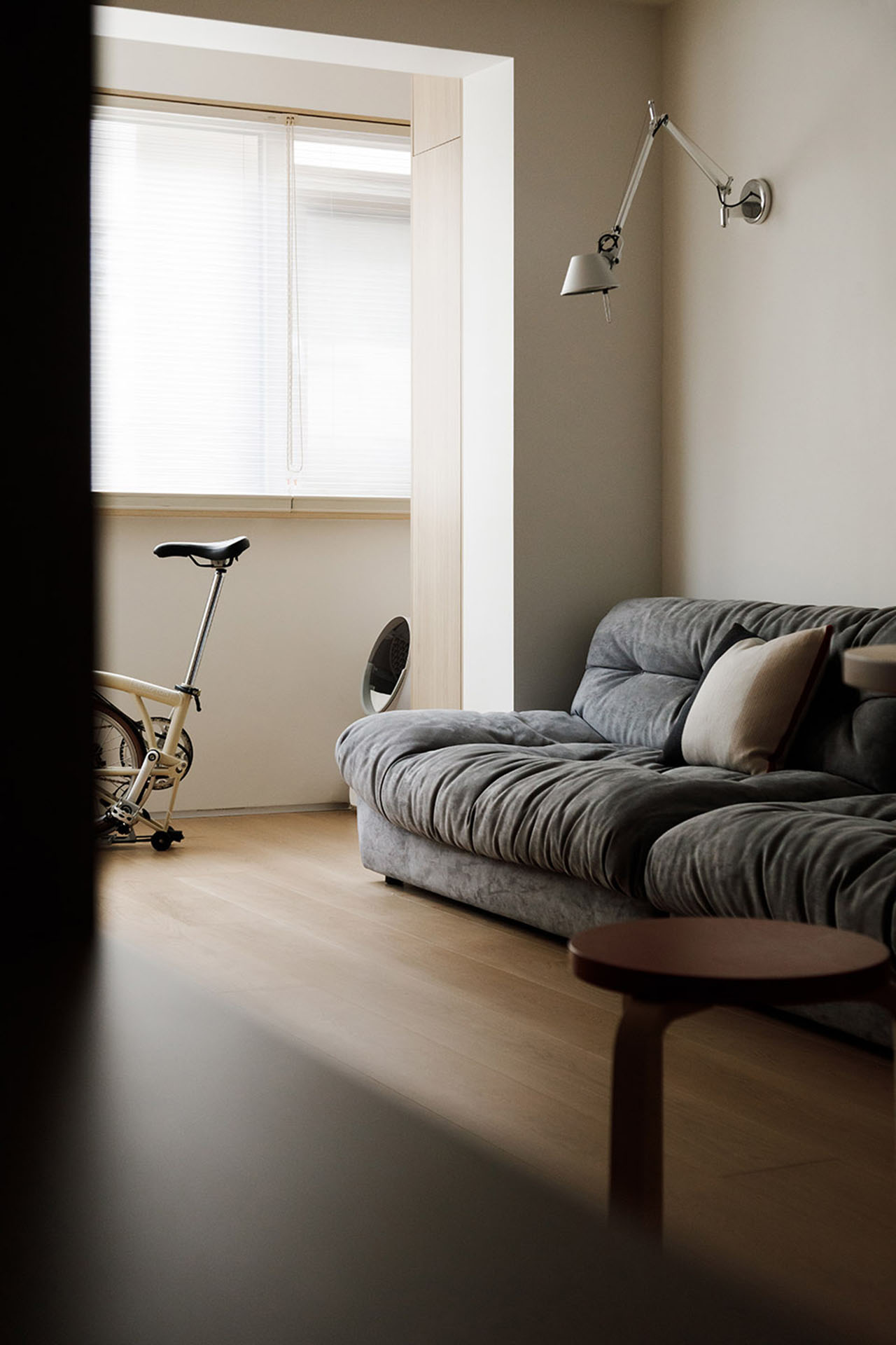 从玄关过道到客厅的视角,同样延续了体块和线条的穿插,为了更大限度的让空间呈现出轻盈的视觉效果,客厅的柜子运用悬挑的手法,承载了临时衣帽、梳妆、日常收纳等功能储物的需求。蜂巢帘过滤掉外界的杂质将光线柔和进空间,主人的爱好作为展示陈列在空间中。柜子结构与光线虚实变化构建出的静谧空间,色彩的加入更赋有生机。