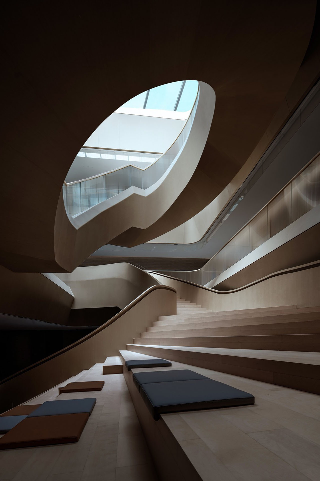 “环抱双跑梯”“海螺”状路演梯和连接地下层的“簧形”旋转梯等被“放置”于开阔的中庭,在大面积玻璃天顶的投影面里,楼梯的曲线在流动的光影下交错辉映,盛力绽放,展开对未知世界无限探索的欲望。