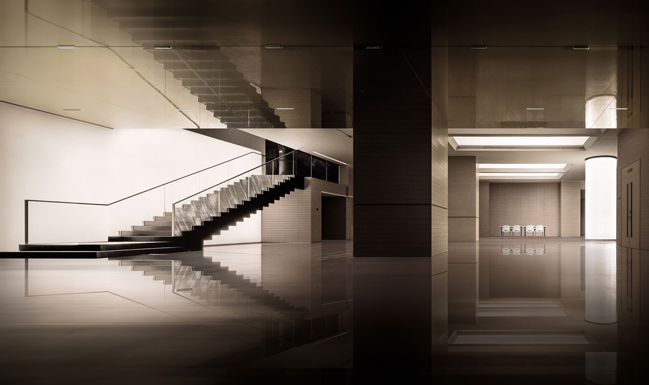 极简风格的走廊,通过面光源及拌颗粒陶板墙面,几何状堆叠的直跑梯创造出一种平静而深邃的空间,表达出极简主义和现代美学的完美契合度。
