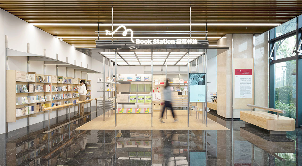 星连书站是由本册选书与苏州轨道交通共同策划的自营书店品牌。项目位于苏州黄天荡地铁站出口写字楼大厅内,是一次将“出行”与“读书”相结合的探索。书店的性质不同于大型全类别书店,亦有别于个体独立书店;如何在地铁站快节奏的环境背景下融入一个与阅读行为相关的场所成为本次设计的挑战。