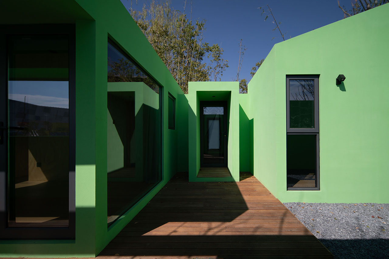 绿洲选址在一个迷你的湖心岛,岛很小,似乎仅仅能放下一栋木屋。因为该岛离周边业态很近,所以我们希望木屋是一个尽可能覆盖小岛的内向型空间。业主希望房子不要太过突兀,于是我们选择纯绿色包裹建筑,这是每个人的假日绿洲。