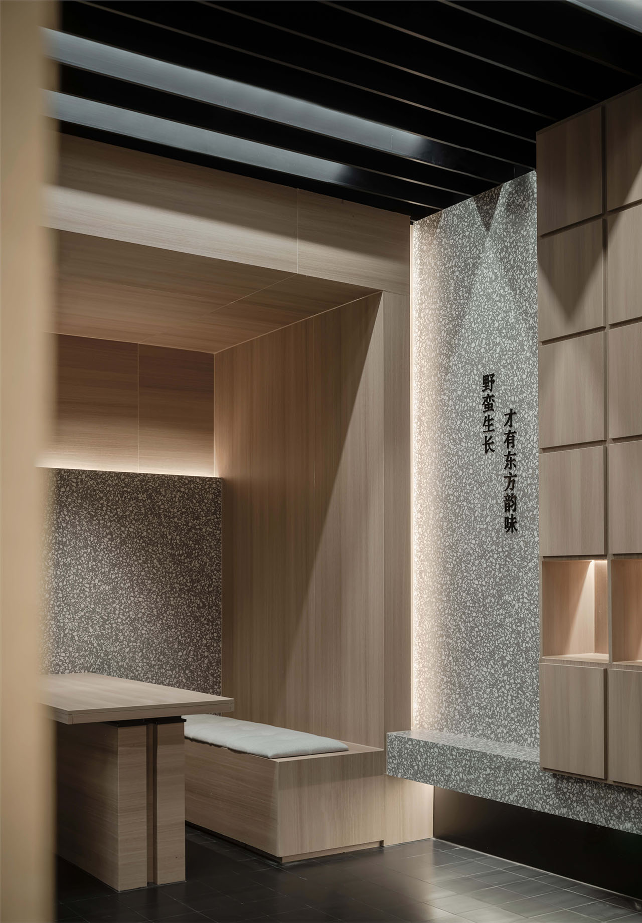 茶空间的另一入口直通商场外部,但因被消防楼梯和商场走廊的挤压,仅存一个窄长的过道区域和外摆区。设计师利用曲折的动线,将外摆区作为茶室与外界的展示窗口,利用钢板与水磨石构建,山型和坡屋顶,打造入户门头,厚重的质感为开启进入的过程带来了一种别样的仪式感,利用过道空间打造了一个座区长廊,门扇启闭之间,从入口的开阔到走廊的狭长,犹如一场身心在尘世间的穿越,与闹市相隔。