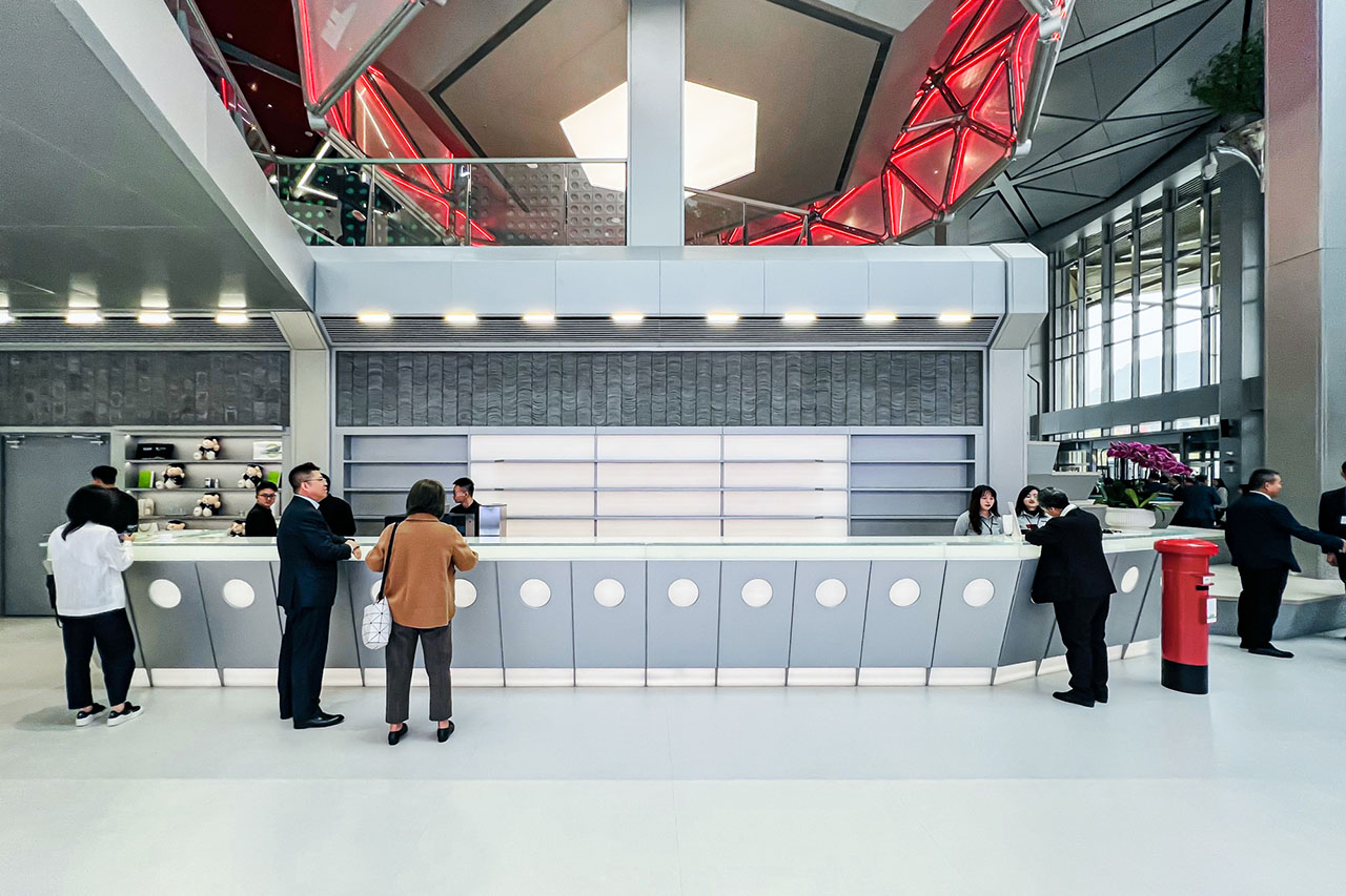 aoe事建组打造了一个兼具现代科技与传统优雅的前厅空间。通过三层挑空设计和大型屏幕的应用,赋予了空间未来感和科技感。银灰色调的融入,更是突出了冷峻与高科技的氛围。在接待区域,以 “门当户对”为原型的装置为空间增添了一抹独特的中国元素,使整个前厅空间在现代与传统之间达到平衡。