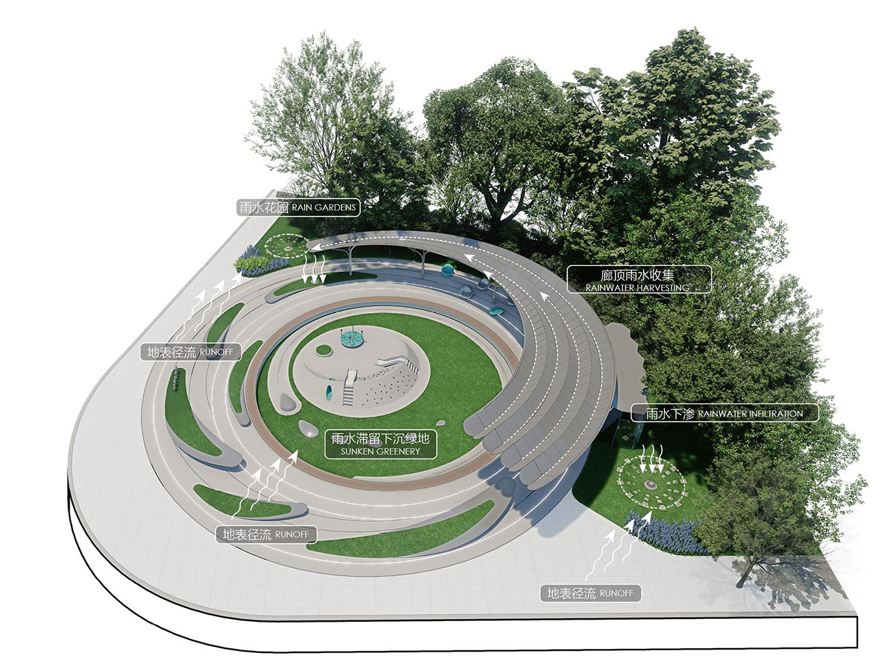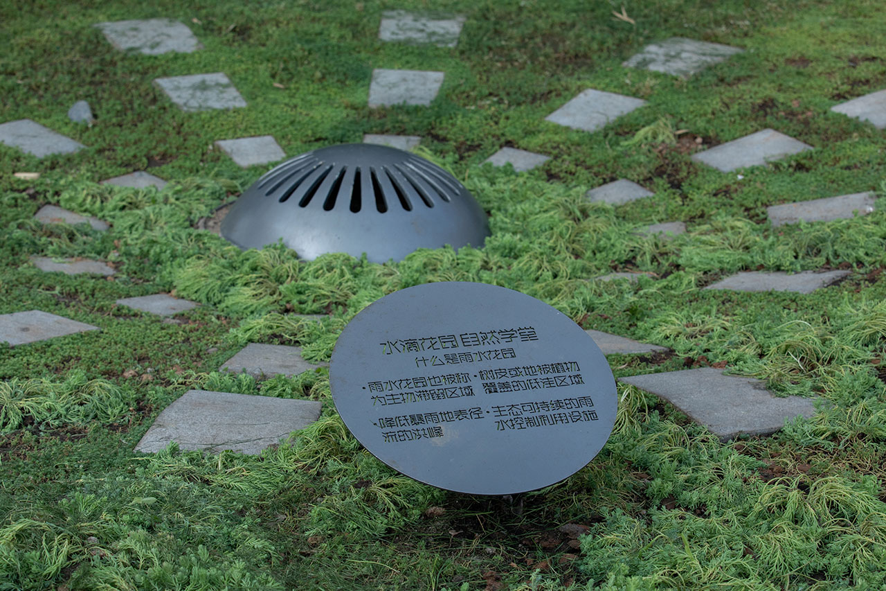 旋转水滴公园也是一次城市雨水花园的小型实践,充分收集了场地内地面和水滴廊顶的雨水,通过植物、沙土的综合作用使雨水得到净化,并使之逐渐渗入土壤,涵养地下水。
