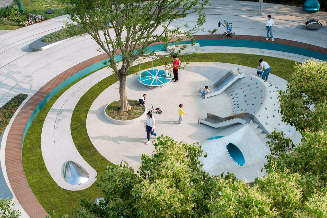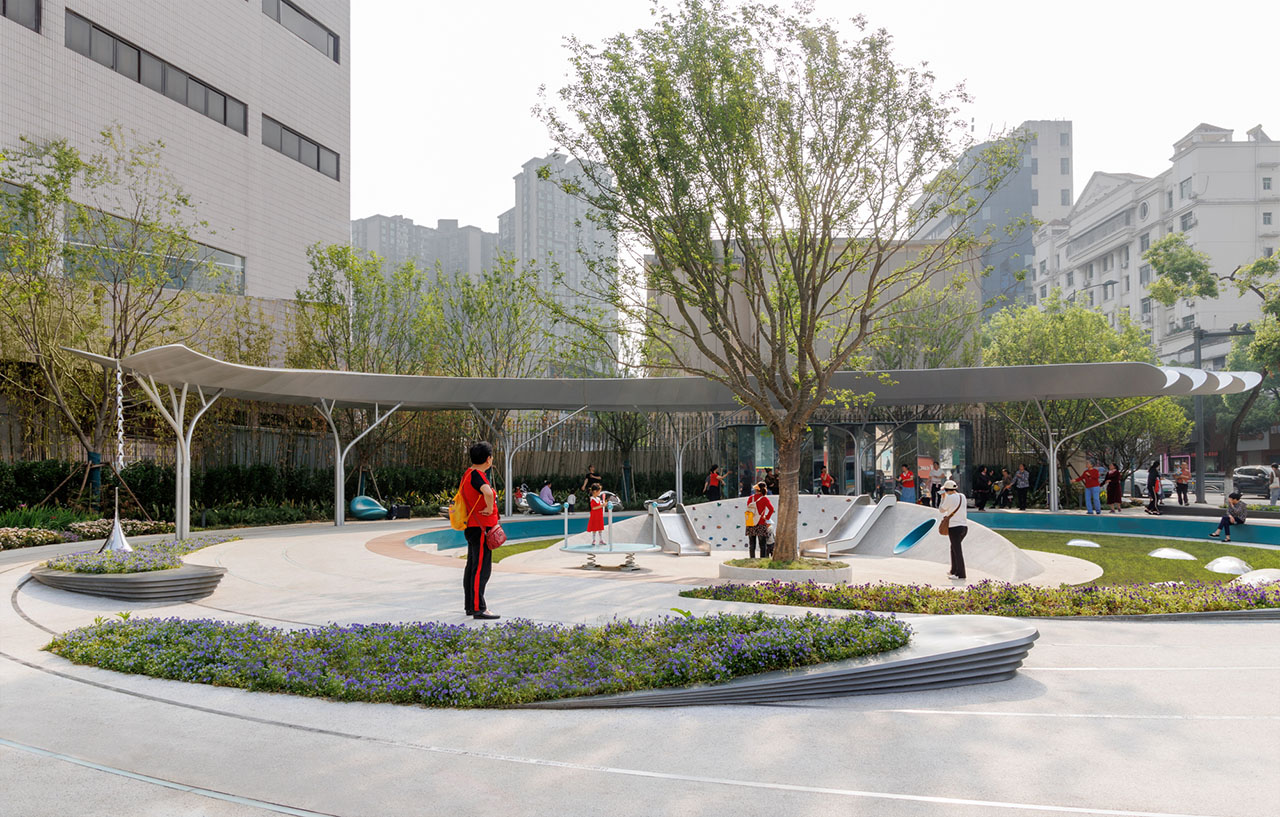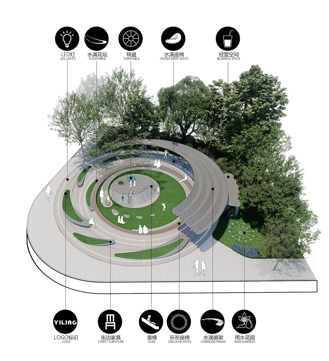 整个场地由活力山丘、旋转水滴廊、水滴城市家具、雨水花园等多个设计要素构成,构建成为了充满活力的街角公园。