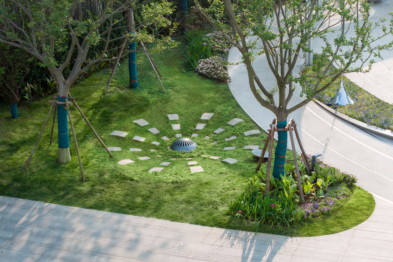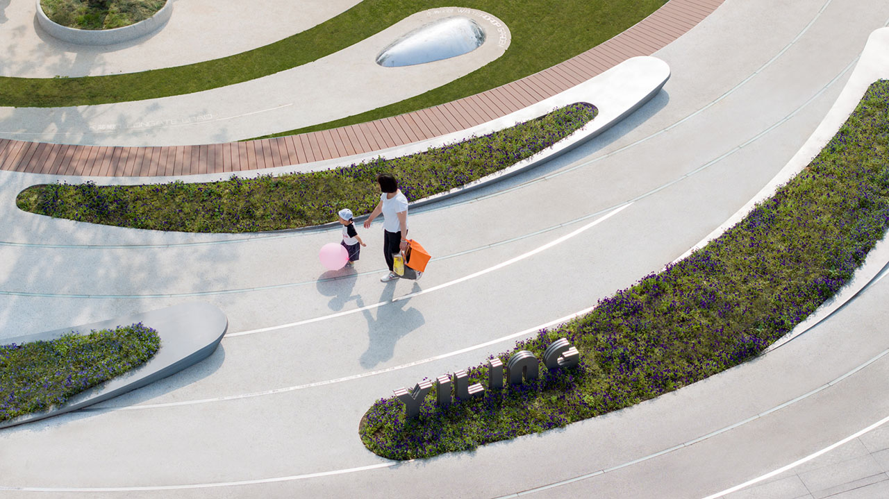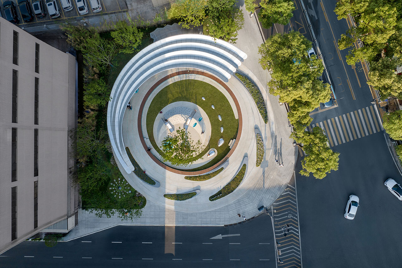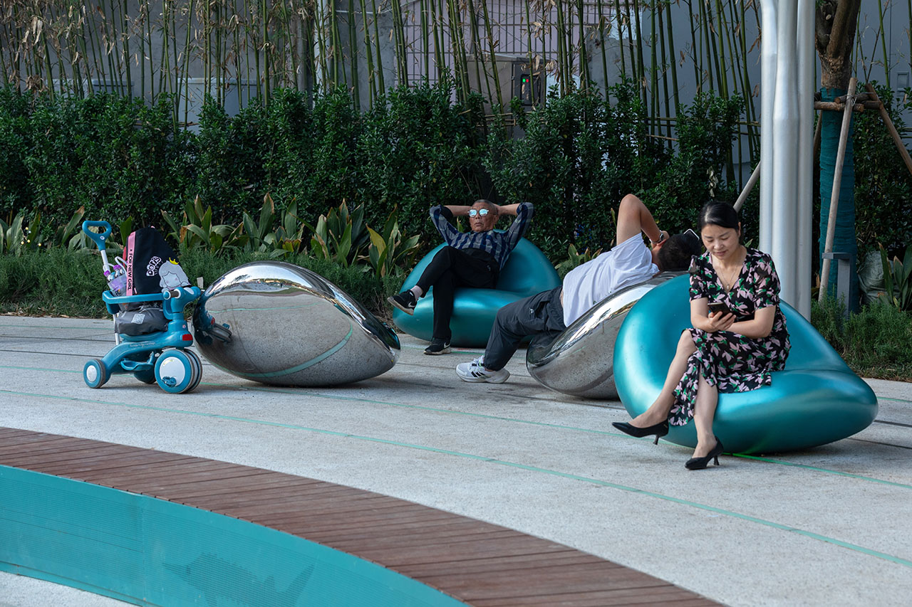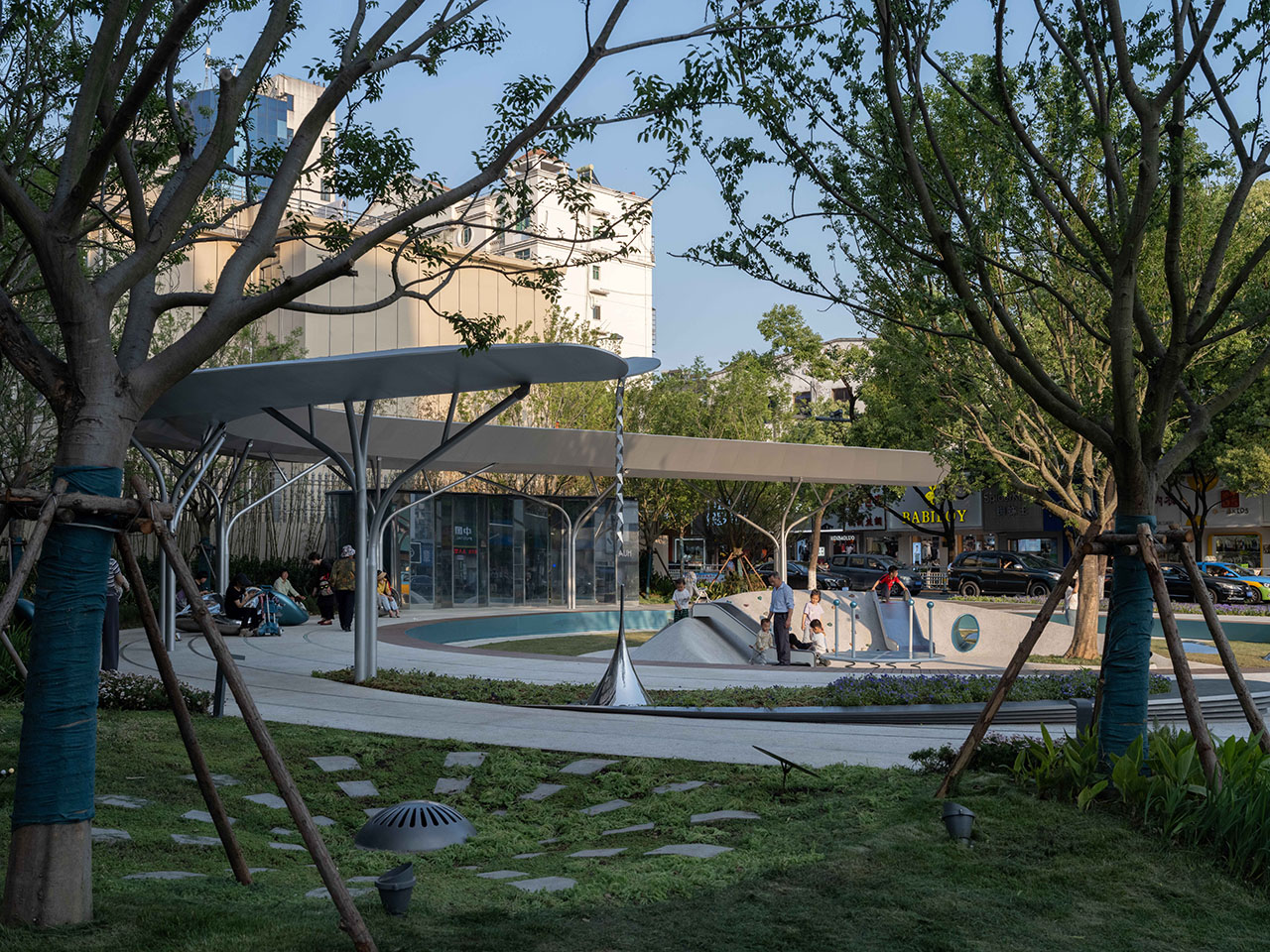 水滴旋转出的瞬间动态,衍化成为了这个街角独一无二的城市家具。无论是草坪上甩出的水滴雕塑、还是廊架下可让人躺坐的水滴座椅、或者作为城市边界的旋转水滴花坛,都让这个街角更具识别性和魅力。
