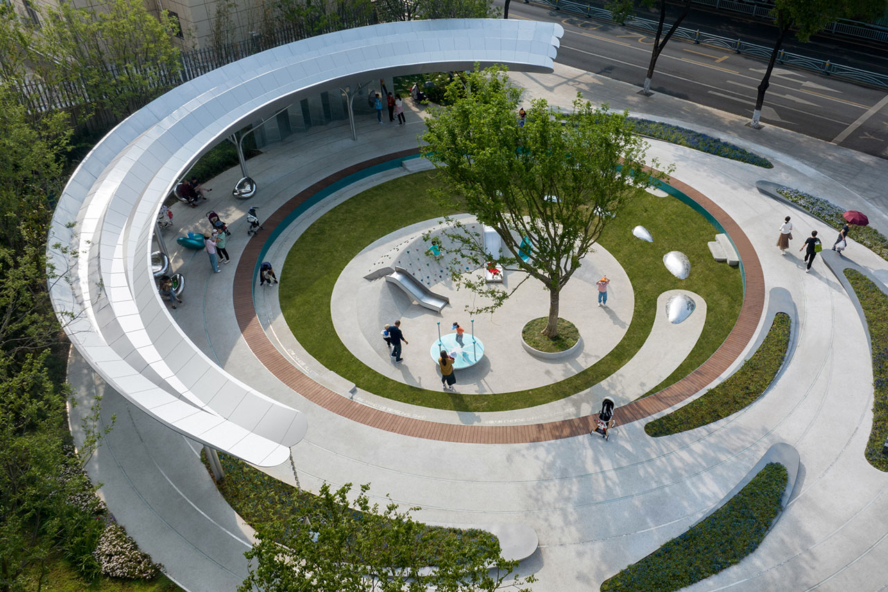 建成后整个场地成为了一个拥有行人等候空间、大人看护空间、孩童玩耍空间、城市经营空间的多维度复合型街角公园,甚至被城市居民自由发挥成了闲人发呆空间、小商贩摆摊空间、阿姨舞蹈空间、儿童放风筝空间等等意想不到的使用方式。于是这样的故事会每天在这个公园里发生:大爷躺在廊架下戴着墨镜看着小孙儿和玩伴在下沉草坪里跑跳;有可能大孙儿正在旁边的小学里上课马上下学要路过这里;说不定老伴在旁边穿着鲜艳的衣服跳着广场舞;搞不好女儿在一旁花坛上坐着抠手机照看着孩子;也可能儿子刚好在旁边的大楼里上班,而自己家正好在边上的夷陵三巷,这算不算一个街角公园给一座老城带来的幸福感容器。用一个动态瞬间定格的圆生成的公园空间,解决街角当下我们能看到的所有问题以及未来可能会出现的问题,给这座不断更新中的老城一丝丝幸福感,作为设计师好像也有了点纳什均衡的满足感,最后感谢这个街角公园所有参与者的付出。