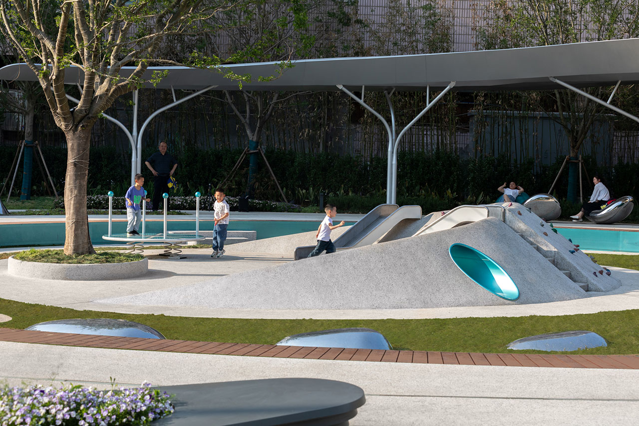 高出草坪1.2米的小山丘带来的活动空间,是献给周边孩子的礼物。草坪下沉450公分,让这个场地的边界天然有了家长看护的座椅。活动转盘、攀爬山丘、钻洞筒、大小两组滑梯让孩子们有无限玩乐的可能。草坪上甩出的草坪水滴雕塑,也成为了儿童跑跳的对象。