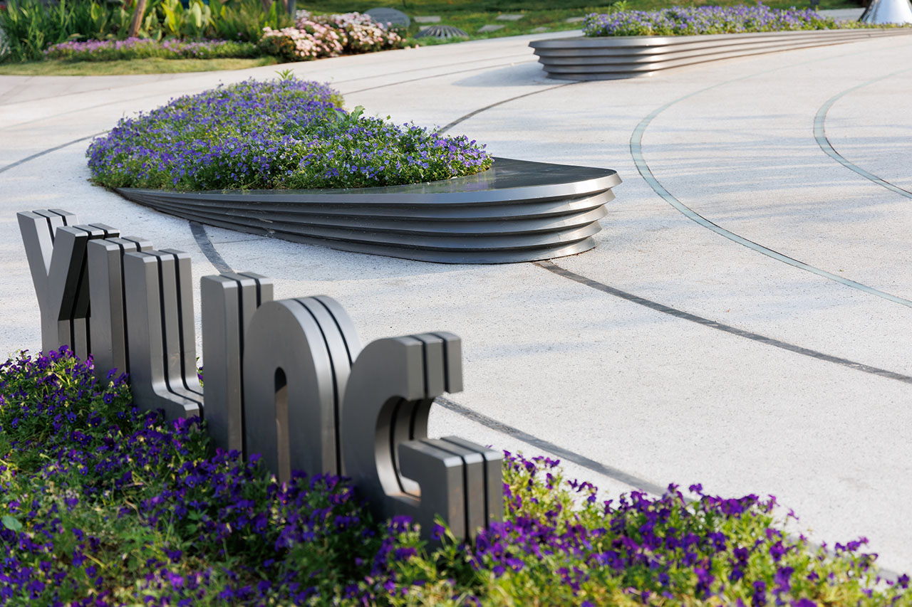 在这个由动态旋转水滴为内核的场地构建过程中,有大量非标物料的落地,包括且不限于廊架、花坛、雕塑、座椅。设计在过程中以精细化的场地白模推敲空间尺度分析构成关系,并深入参与到构建的每一个主材和节点把控中。