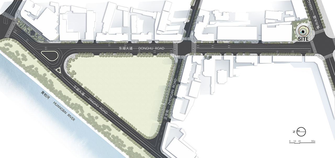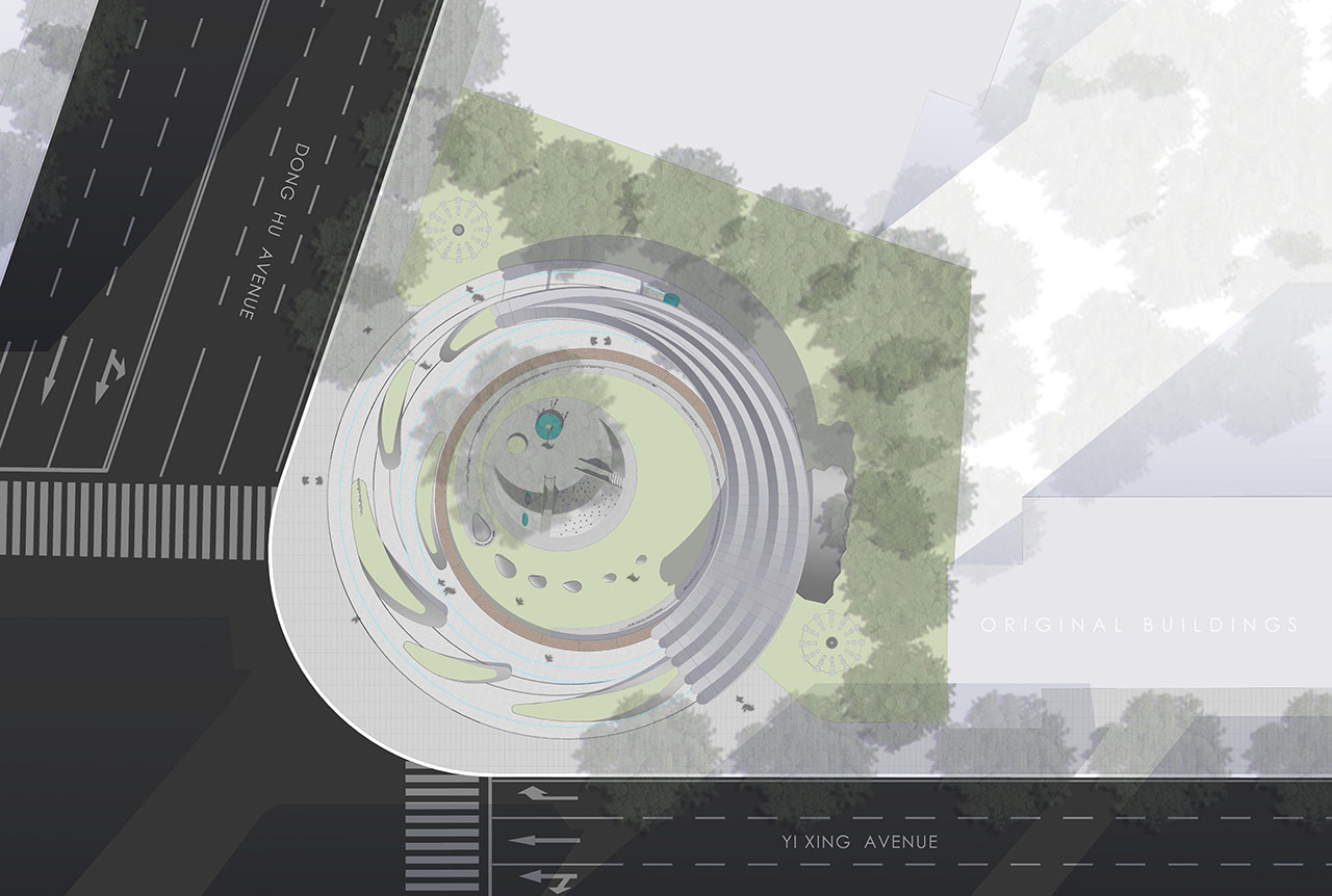 作为夷陵区最繁忙的十字路口,每日会有大量的人流在此路口停留驻足,如何构建场地肌理有效引导人群进入空间内部,并不影响城市人行道交通,是第一挑战。