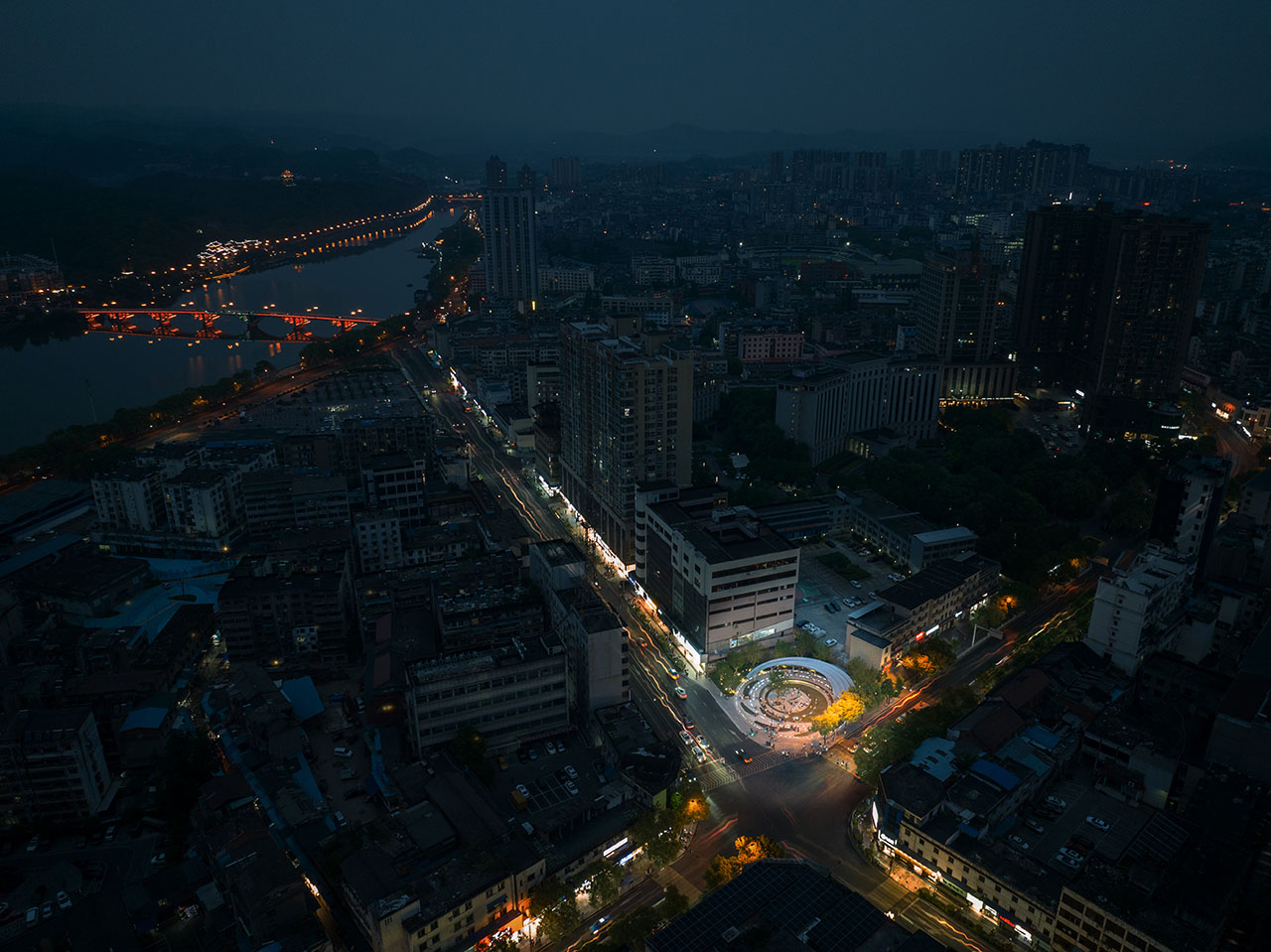 稳定中的无限运动水滴构建起来的空间秩序,有效的引导着城市人流。由旋转花坛、地面LED灯带构成的环,不是单纯的静态同心环,是类似运行中的曼陀罗曲线定格的那一瞬间。类曼陀罗曲线带来的瞬时动感,让整个场地既有如水滴落下的涟漪感,又有水滴甩出环绕的动态感,所有动线都依着一个内核而生,有互相独立的动力又有互相依存态势。