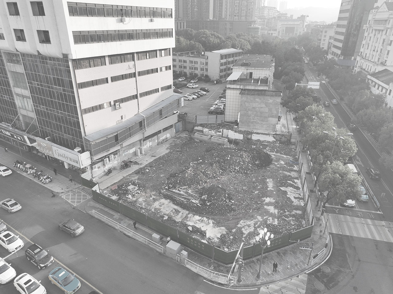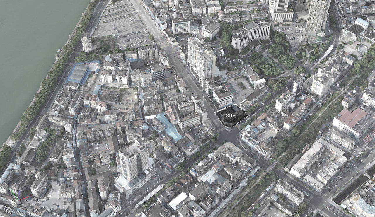 项目位于宜昌市夷陵区的最核心区域,是东湖大道城市更新项目的重要节点。更新前的城市空间和面貌已经不再能满足小溪塔片区居民的生活需求。项目西侧与南侧分别是夷陵区重要的城市主干道东湖大道与夷兴大道,因此这个路口在更新前充斥着拥堵的车流和人流。于是拓宽车行道路成为改造的第一块踏脚石。拓宽后的建筑显得面貌陈旧,人行空间拥挤,因此在不断地讨论推翻再重构之后,拆除这座金三角大楼成为第二块踏脚石。
