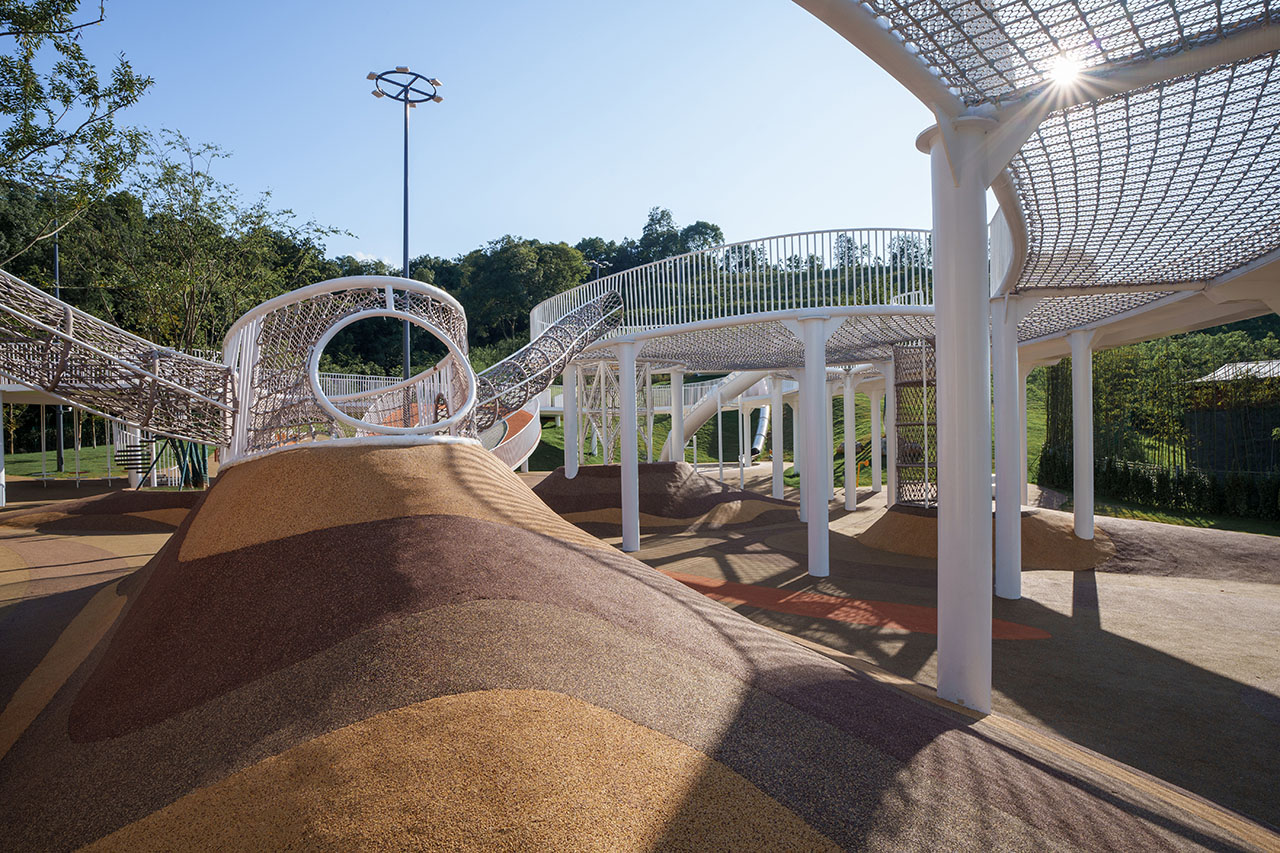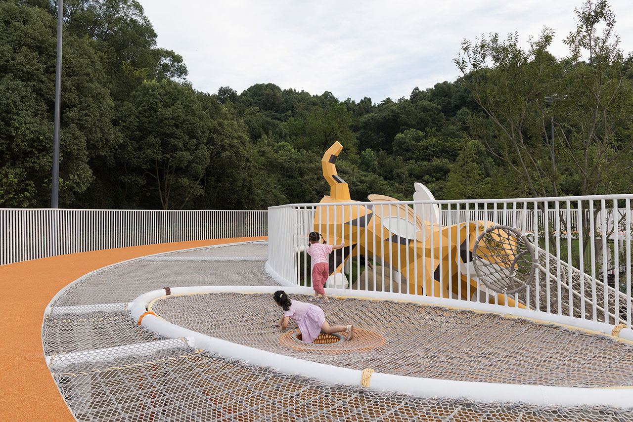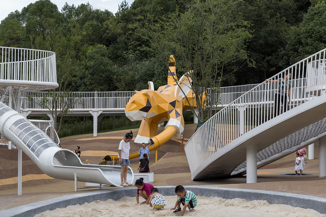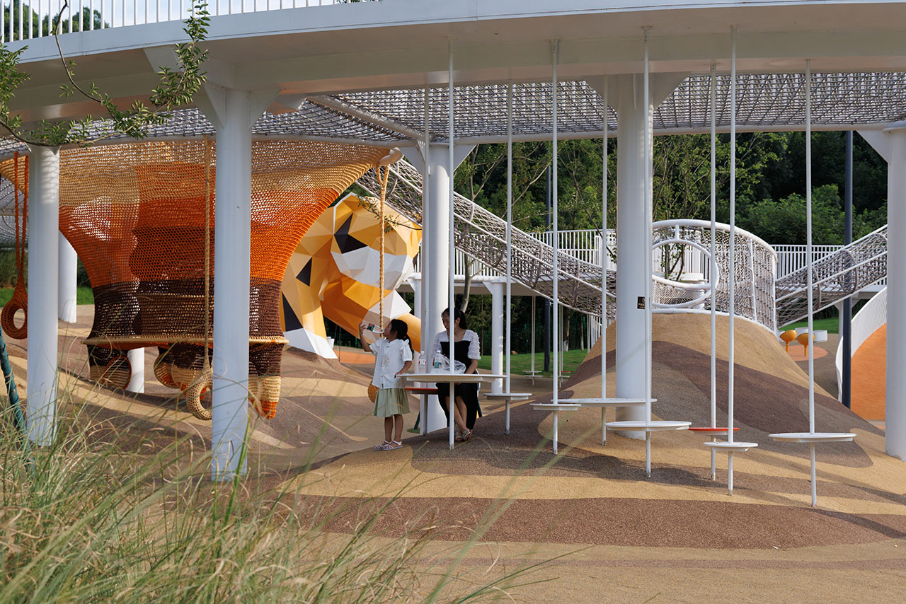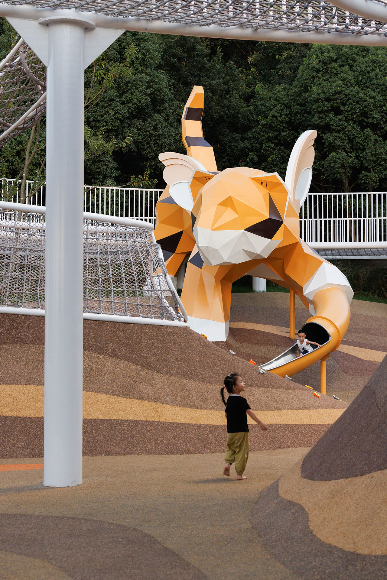 以探险环和山丘地形为场地基底,有机融合了包括山涧爬网、垂直爬网、旋转楼梯、拓展云步、虎猇滑梯、虎虎蹦床、水滴座椅、山峰滑梯、水滴滑梯、山顶爬网、山坳沙坑、虎穴吊网、虎尾巴传声筒、廊下秋千、旋转爪爪、大冒险滑梯等十六种游乐器械。器械的数量是有限的,但充满创造力的孩子可以在山丘、冒险环、器械之间开发出无数种游乐方式。