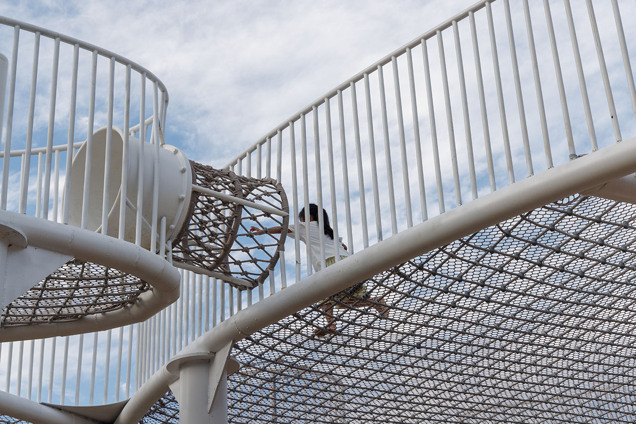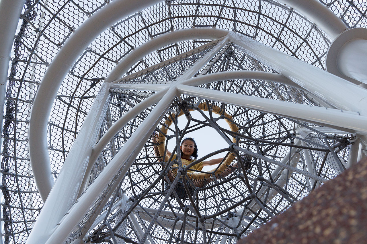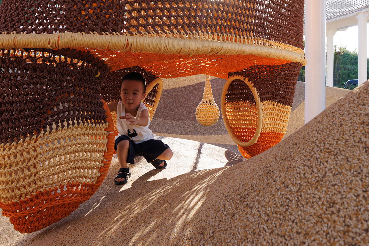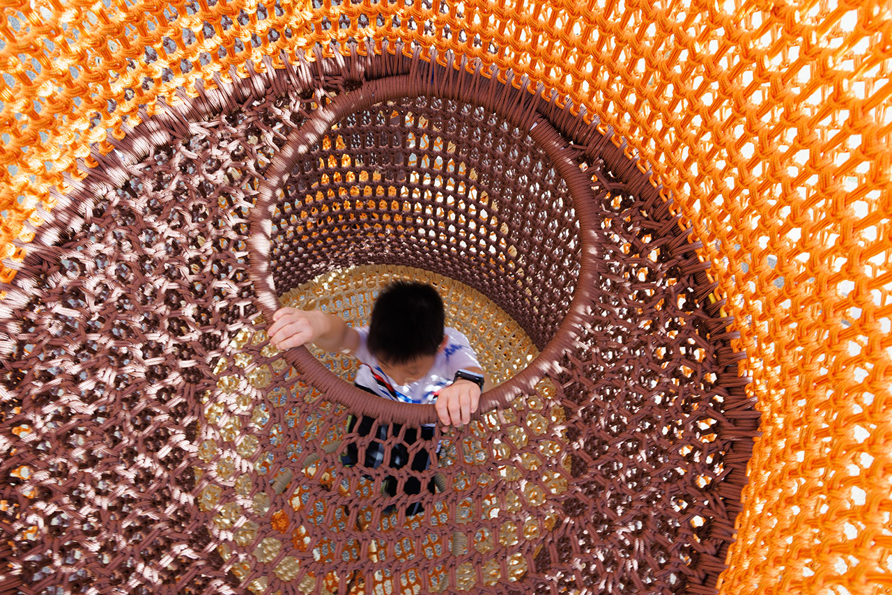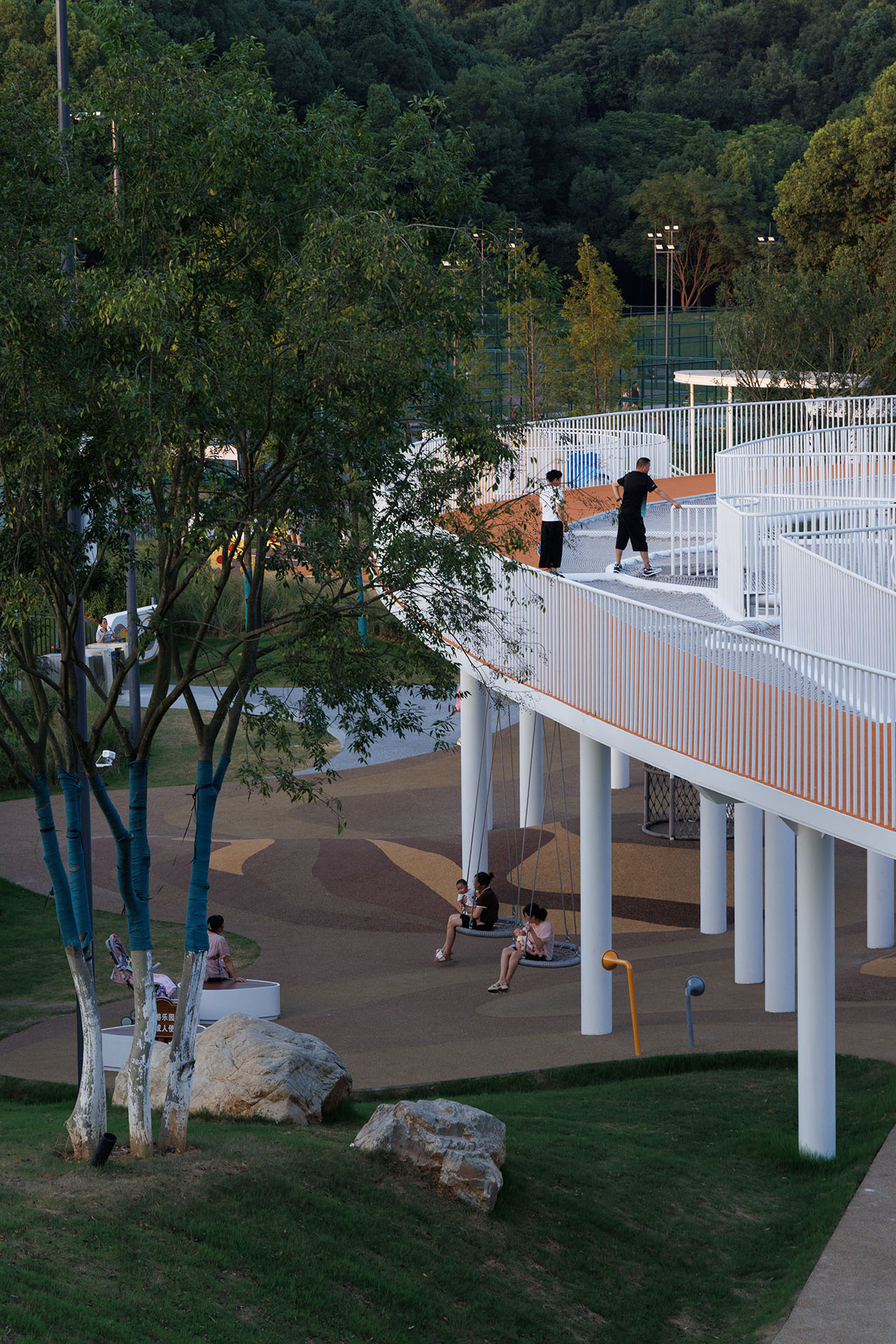 以探险环和山丘地形为场地基底,有机融合了包括山涧爬网、垂直爬网、旋转楼梯、拓展云步、虎猇滑梯、虎虎蹦床、水滴座椅、山峰滑梯、水滴滑梯、山顶爬网、山坳沙坑、虎穴吊网、虎尾巴传声筒、廊下秋千、旋转爪爪、大冒险滑梯等十六种游乐器械。器械的数量是有限的,但充满创造力的孩子可以在山丘、冒险环、器械之间开发出无数种游乐方式。