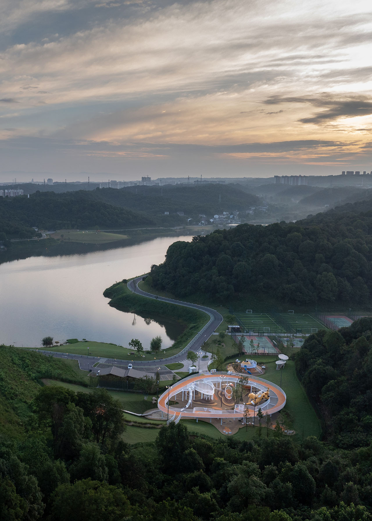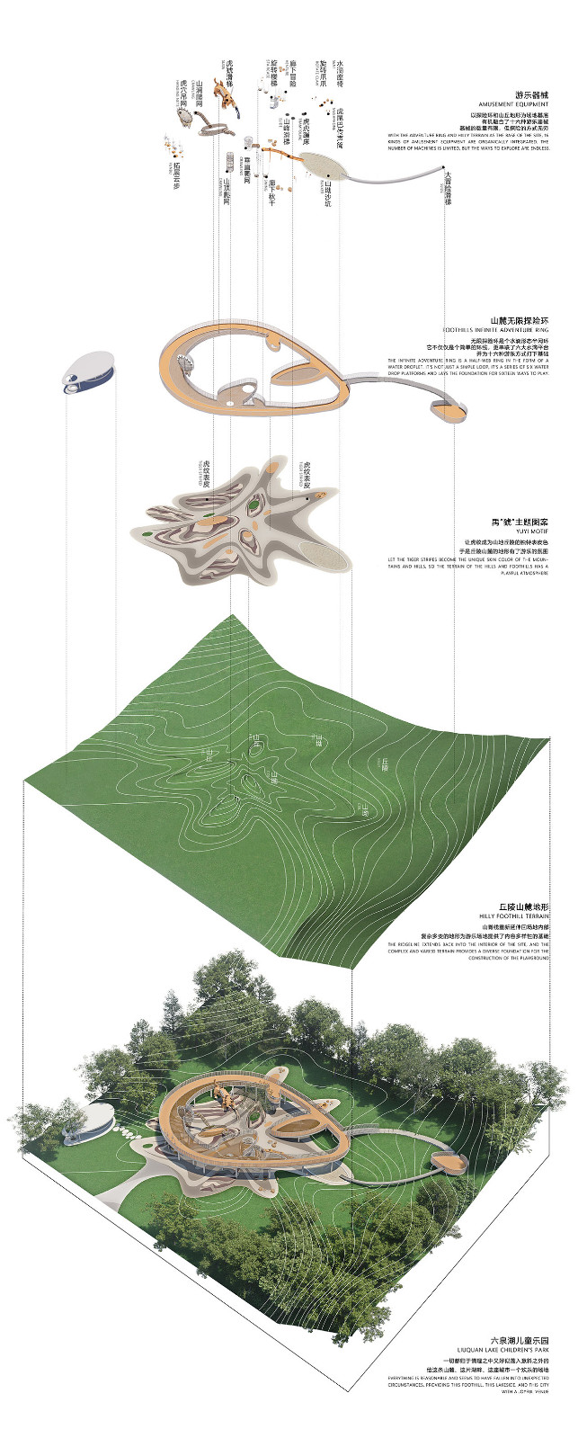 很高兴这次有机会能在山湖交汇的山麓湖畔做这样的充满挑战性的游乐项目,我们试图在设计里回应这块场地独一无二的地形特质,并利用这一特质重新赋予游乐场除器械之外的多样性。这种多样性来自于场地本身的“高低曲折”,而后的一系列构建无论是山麓无限探险环的构建还是禹猇主题的加入,都正应了计成在园冶中所记述的“随势生机”。一切都归于情理之中又好似落入意料之外的给这条山麓、这片湖畔、这座城市一个欢乐的场地。