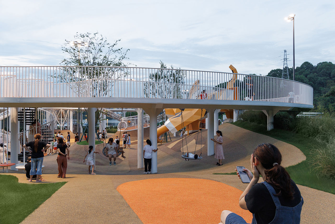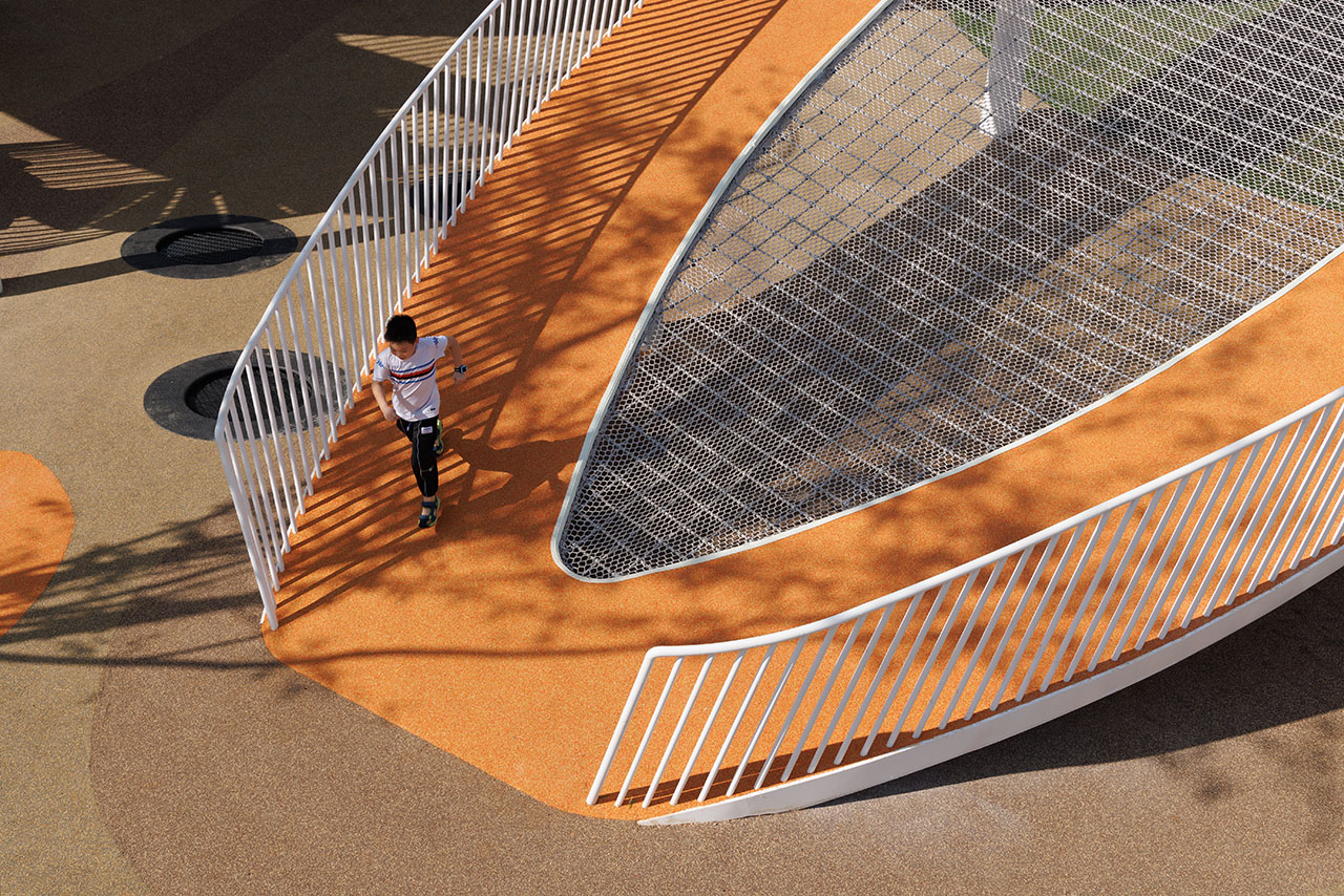 为了让缝合后的山麓带更为有趣,我们在比山坳最低处高4米的净空位置构造了一个水滴形态的山麓环,一个把自然山脊、人造山脊在4米高空串联的山脊环,一个可以把所有游乐内容串联的山脊环。在这个环的作用下,整个游乐空间成为了一个立体空间,而游乐动线在立体空间中被打乱穿插扭曲,无论什么年龄的使用者都可以在探索中迷失时间,它是在山麓间某种意义上的无限探险环。