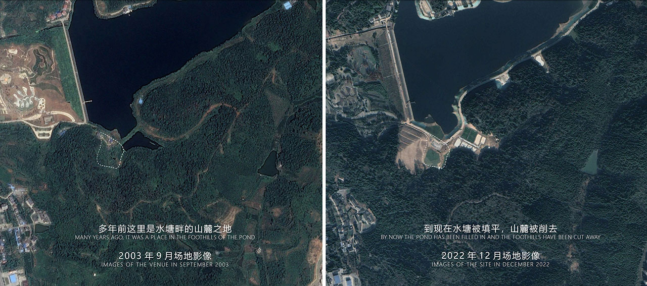 根据谷歌影像显示,这里曾是一片水塘之岸的山麓之地,是山坡和周围平地相接的部分,是一个地形的转折带,也是从山地到水岸的过渡带。虽然彼时山地地形已经由于区域的开发,成为容易碎落的滑坡地,也仍然可以从卫星图中读出山脊线向水岸优雅延申的趋势。