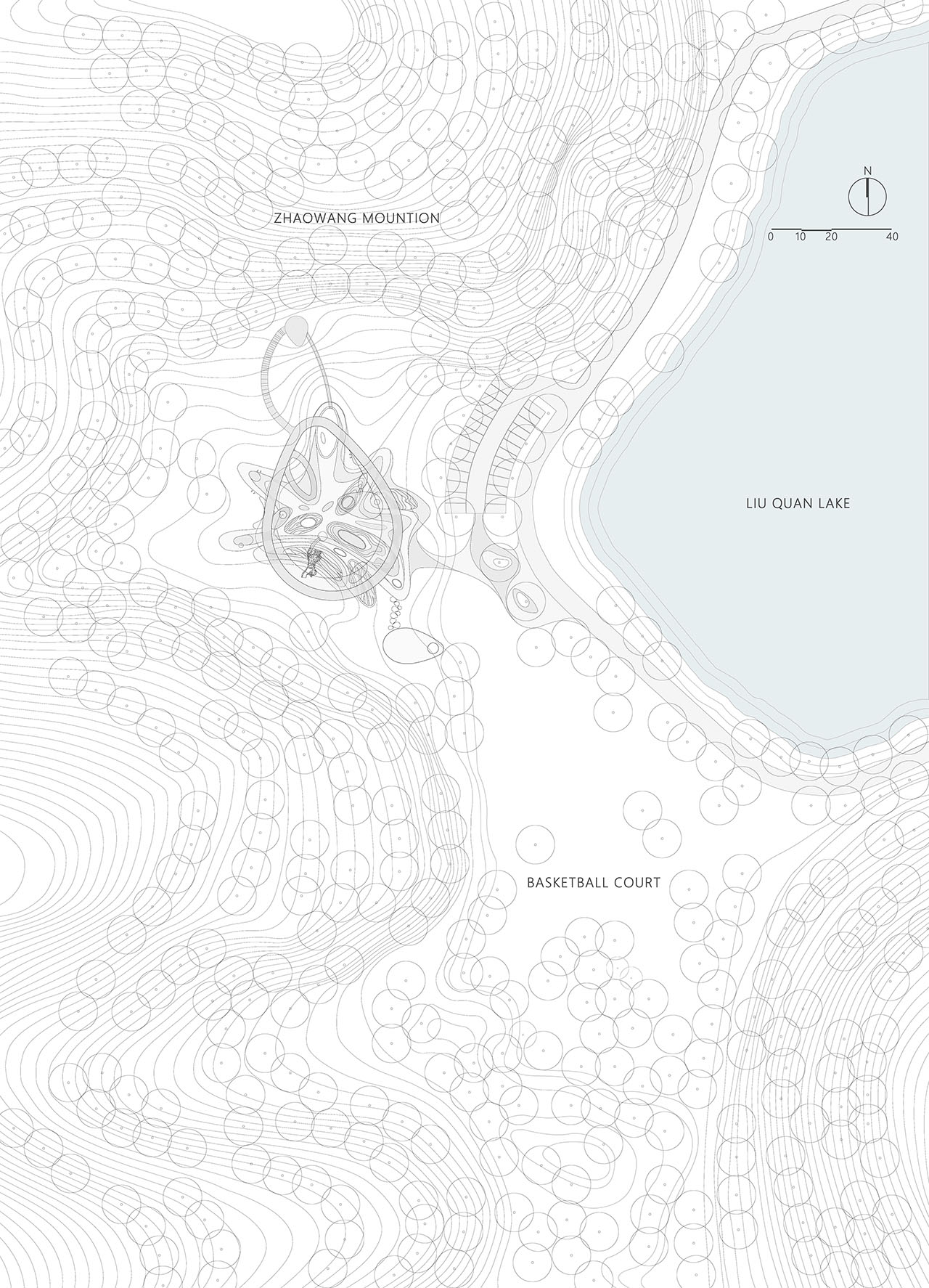 如策略所述,将早已截断的山脊线重新延伸回场地内部,重新构成场地内的山丘、平原、山地、山脊、山坳、丘陵,这些复杂多变的地形为游乐场地的构建搭建了具备内容多样性的基础。原场地本身就带有分水线的的集水功能,我们利用地形重新梳理自然山地边缘将山水绕场地汇集,最后流入六泉湖。