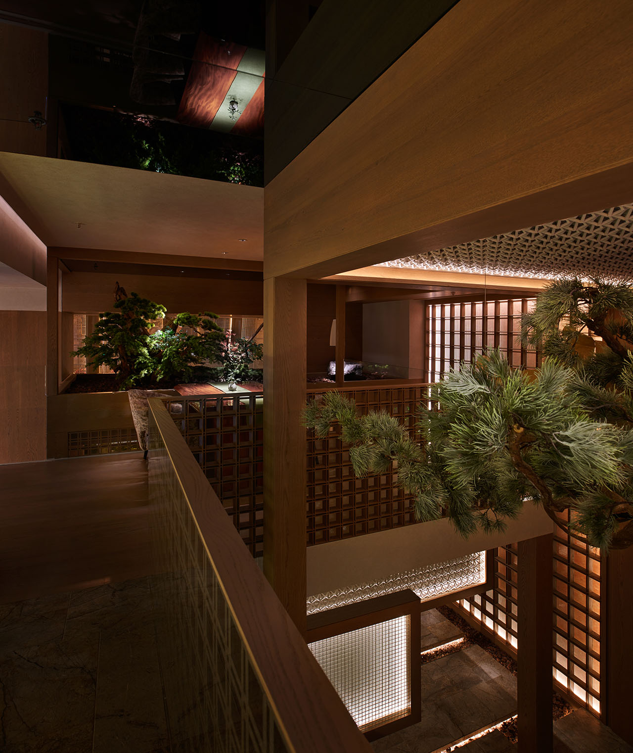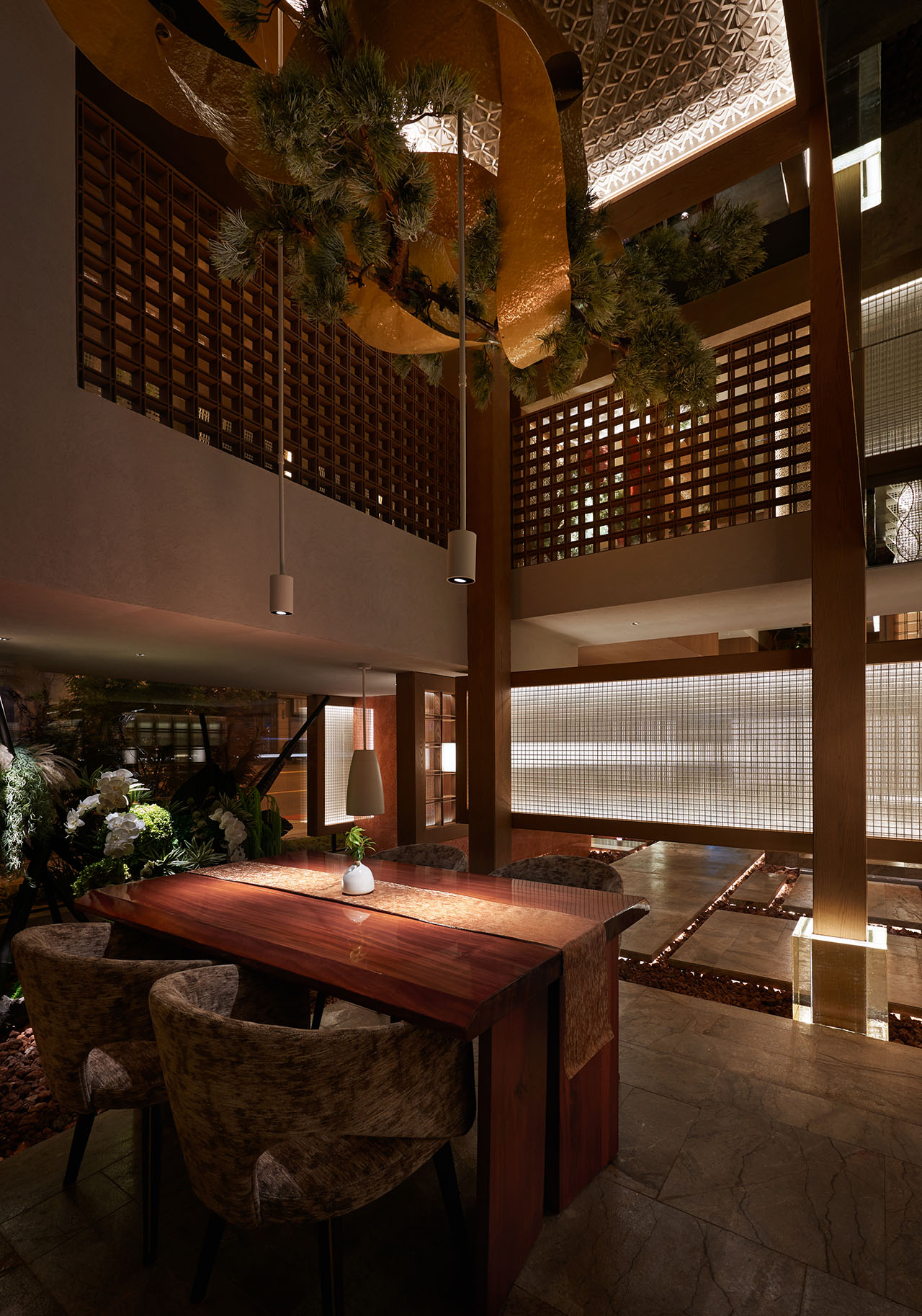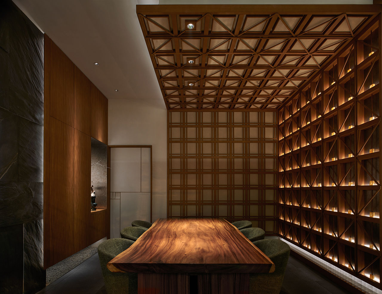 我们将日料餐厅“杉木SUGIKI”打造成城中之外、远离人烟的山林世界,食客在“林水泉石”之间感受东方美学的独特语境。