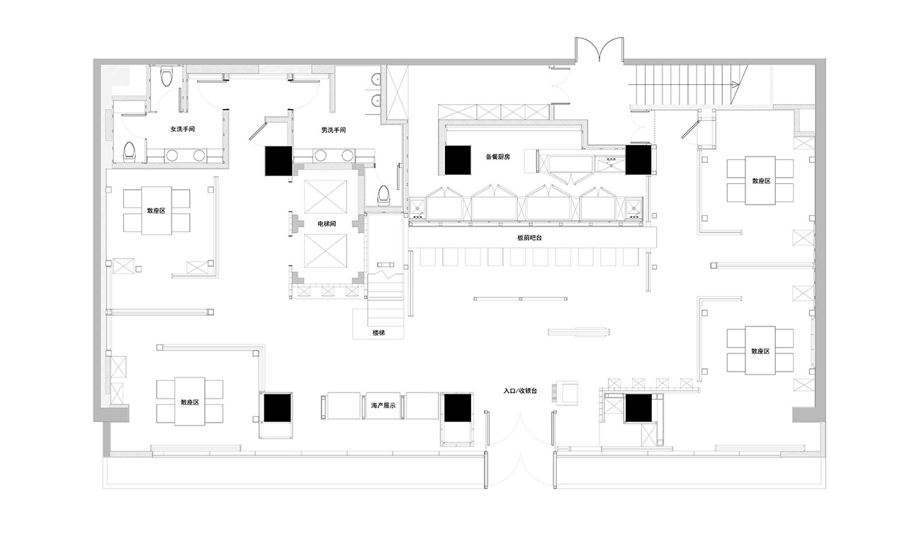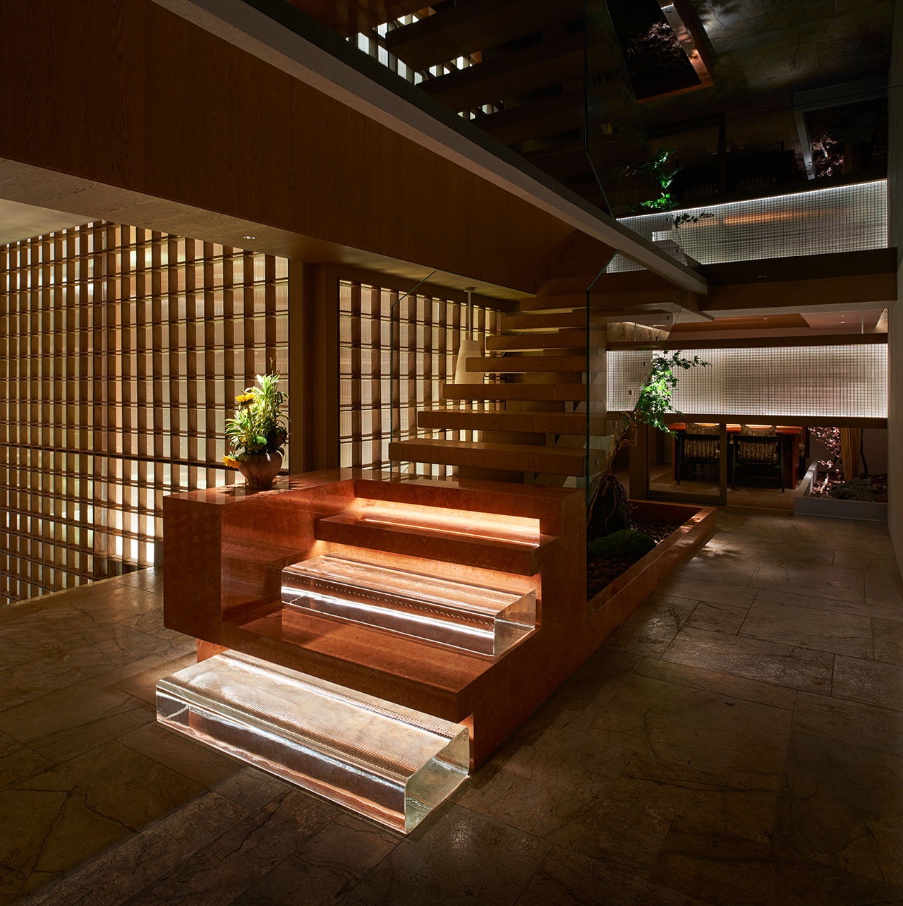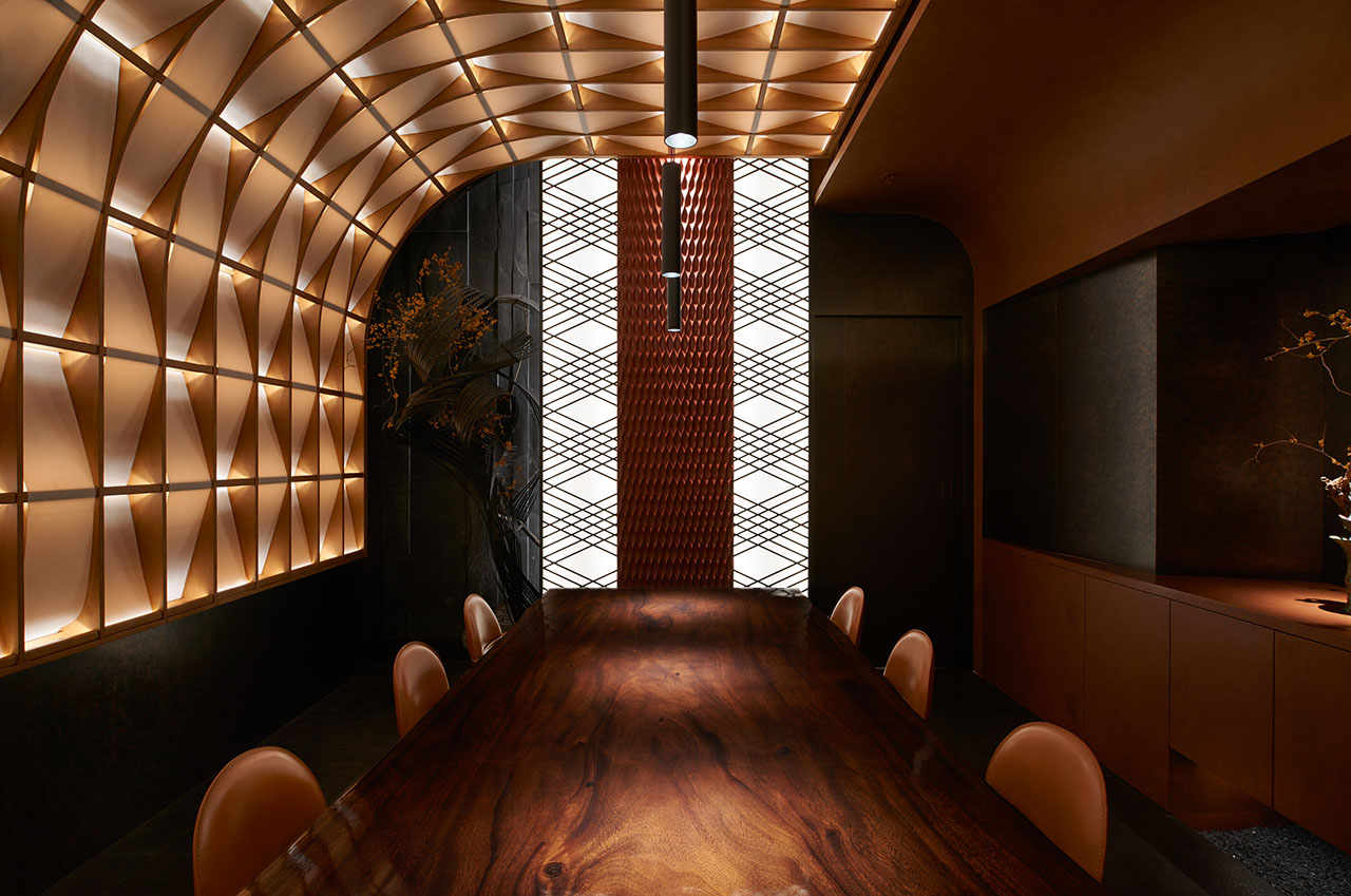 瀑布后是板前区,8米长黑胡桃原木吧台可供10人同时用餐。我们将板前设置在开放的挑空区域,被“奔瀑幽泉”环绕,希望食客在品味美酒佳肴时感受与自然和谐相安的惬意与闲适。