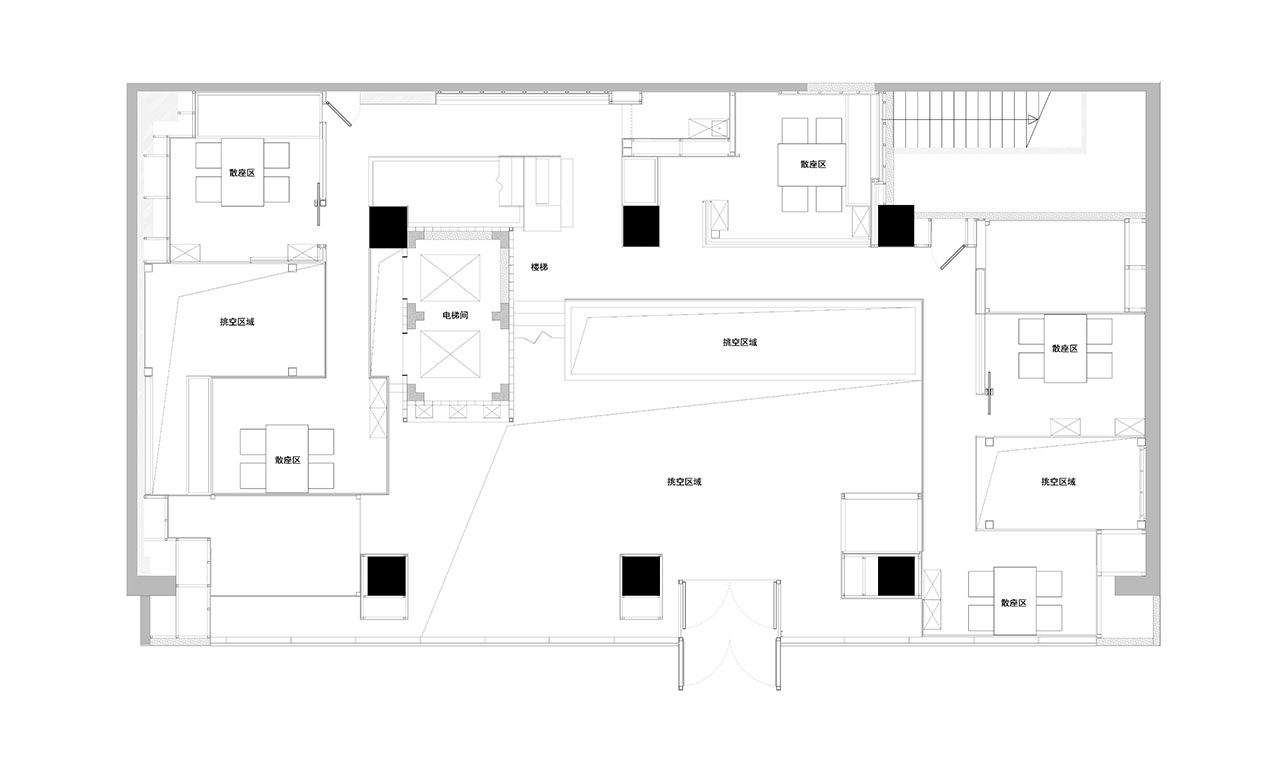 餐厅中穿插着精繁丰富的空间设计。结构外露的酒柜展架、走廊或楼梯间的景观装饰,这些都是散置于主调之间的片刻情境或抒情小品。