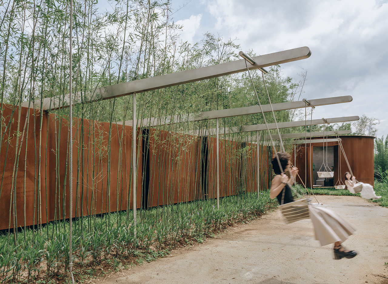 年过六旬的苏轼抵达儋州,离昔日繁华越来越远,亦在反复贬谪的命蹇时乖中转化出苦中作乐的豁然。游人的游览路径也随着苏轼的人生转折,向花厅的另一出口转出。空间从收束到豁开,箱体不断加深的锈迹与颜色在此处戛然而止。来到河边,临水秋千一字排开,银色不锈钢编织网的秋千座椅摆荡,人随秋千愈贴近水面,竟越生出抵抗幽暗的勇气。此刻回望背后与之对应的通廊箱体,方才通廊里关于摇摆的困顿竟恍然顿悟——箱体正随秋千晃荡拉扯而颠簸。洞悉彼时全貌,顿觉释怀,终是与苏轼一同生出“一蓑烟雨任平生”的超脱旷达。而箱子外,游人与村民交织于此,嬉水、出神或垂纶,景色大敞,风水人,都肆意。