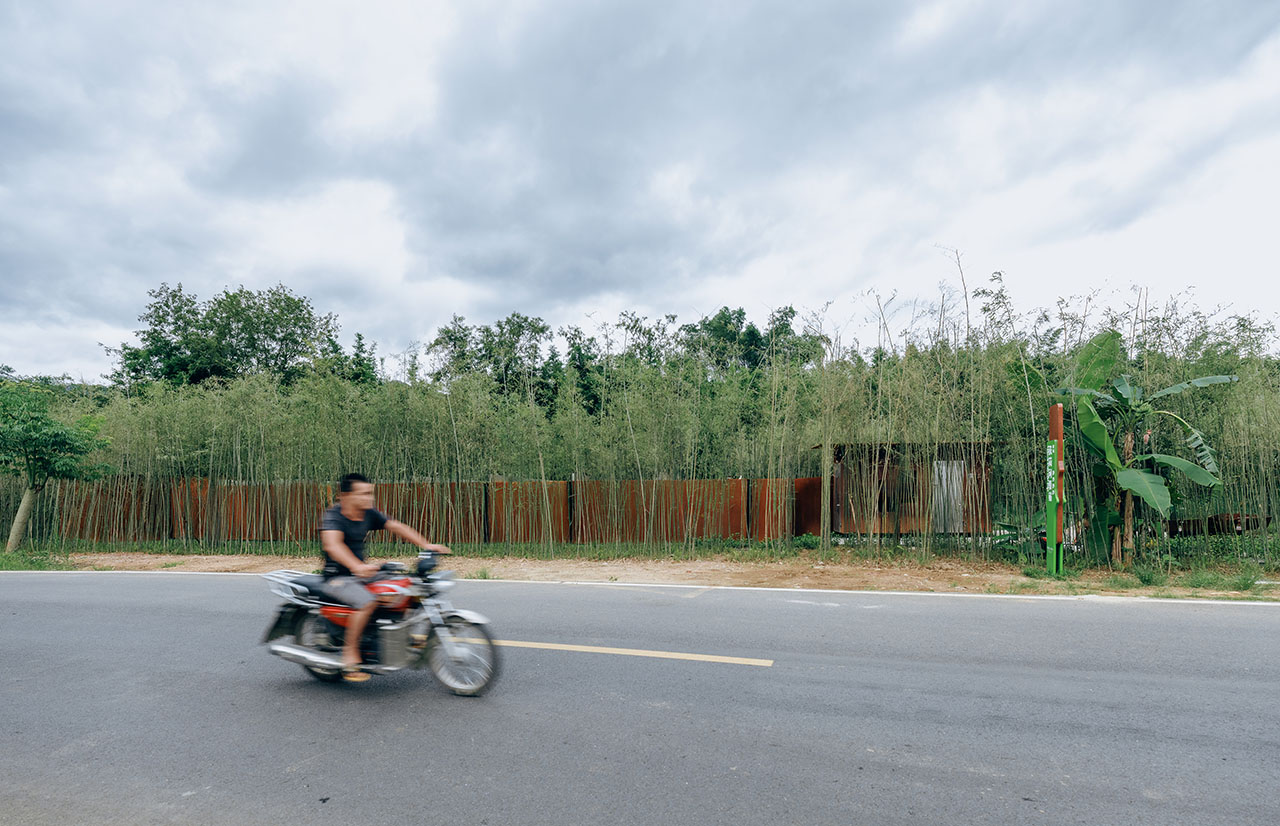 建筑主体采用锈蚀耐候钢板构筑,高2.1米、宽1.2米的狭窄箱体平行错位排列,串联成通廊,侧向预留出轻度变形的余地。出于高效且彻底解决场地排水的考量,地基之上,一公分厚的钢板作为支撑构件,将箱体抬升,从而使建筑与自然地面之间脱开一定的缝隙。而线性建筑体量再不能把大地一分为二——雨水穿过房子下方沿自然地势进入河道,植被也终于连成一片。