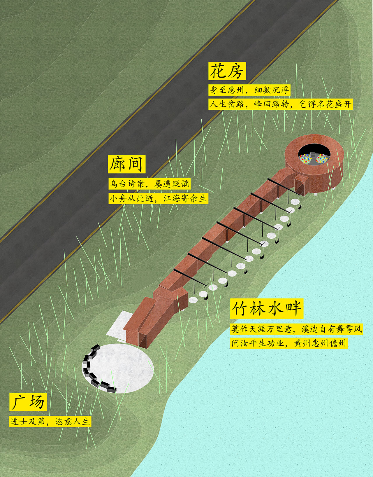 面对“人生十六乐事”的命题作文,步花洄选取十六乐事中“乞得名花盛开”隐喻,一反常规驿站的闲适体验,转而以空间序列变化激发游人的身体本能。苏轼晚年以“问汝平生功业,黄州惠州儋州”总结一生,我们遂将其凝练为从最初晦暗不明、身不由己,到最后开阔澄明的空间体验,呼应苏轼一生的起伏转折。