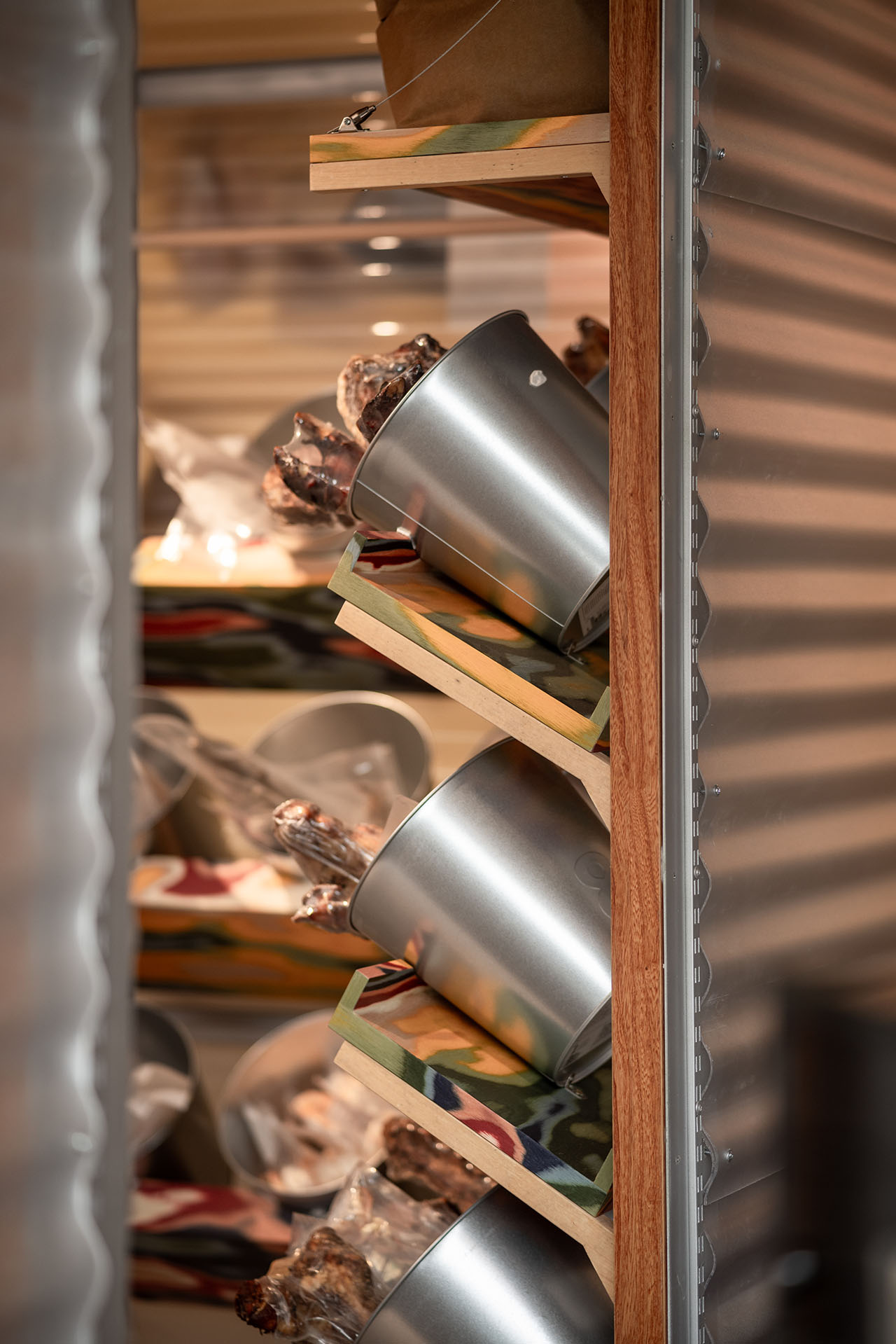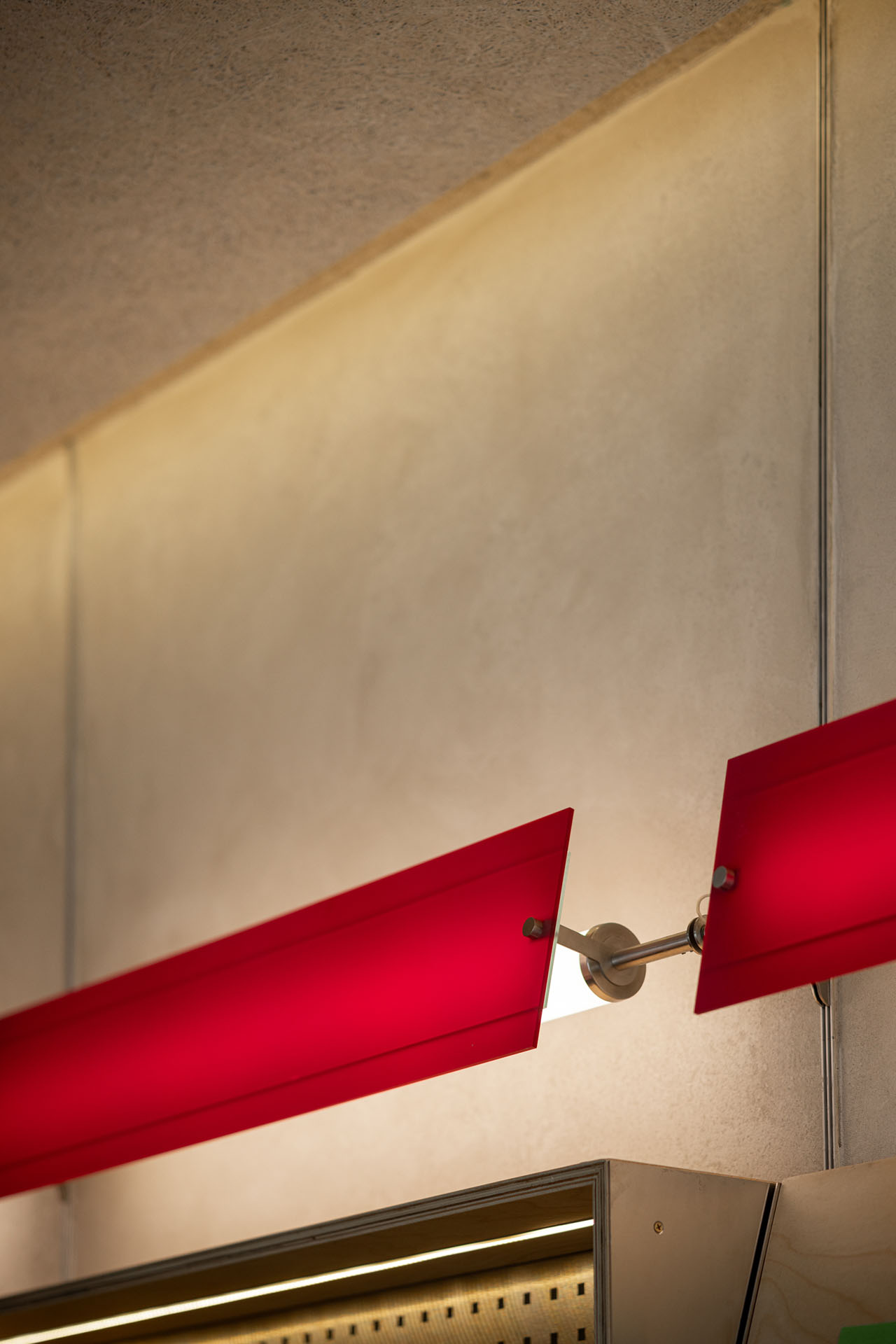 建构的方盒子,我们希望是轻巧且灵活多变的,材质以工字钢和木构为骨架,搭载透明PC波浪板,彩色的搁板则增添几分可爱俏皮。压低的顶面与下沉的地面共同作用,强化了盒子空间的体块和边界。