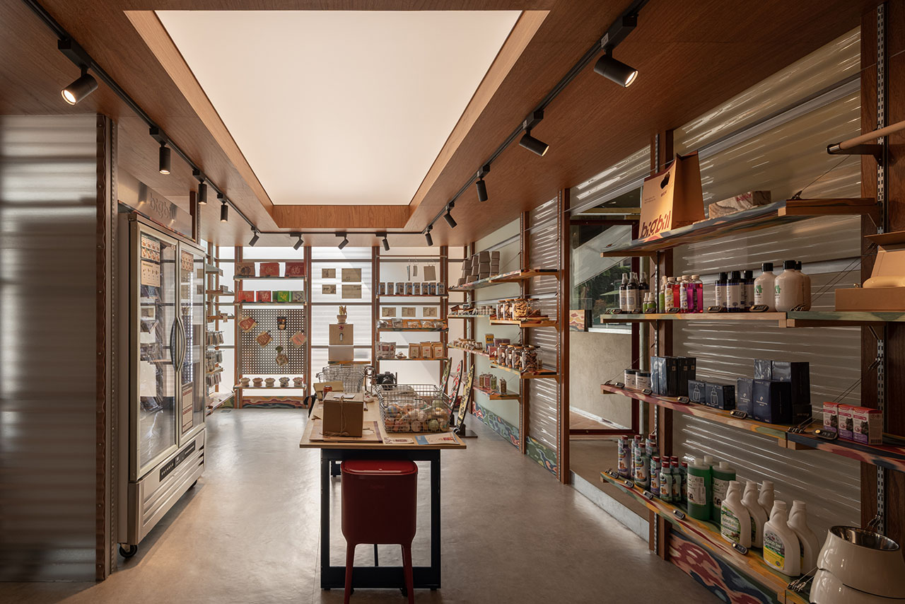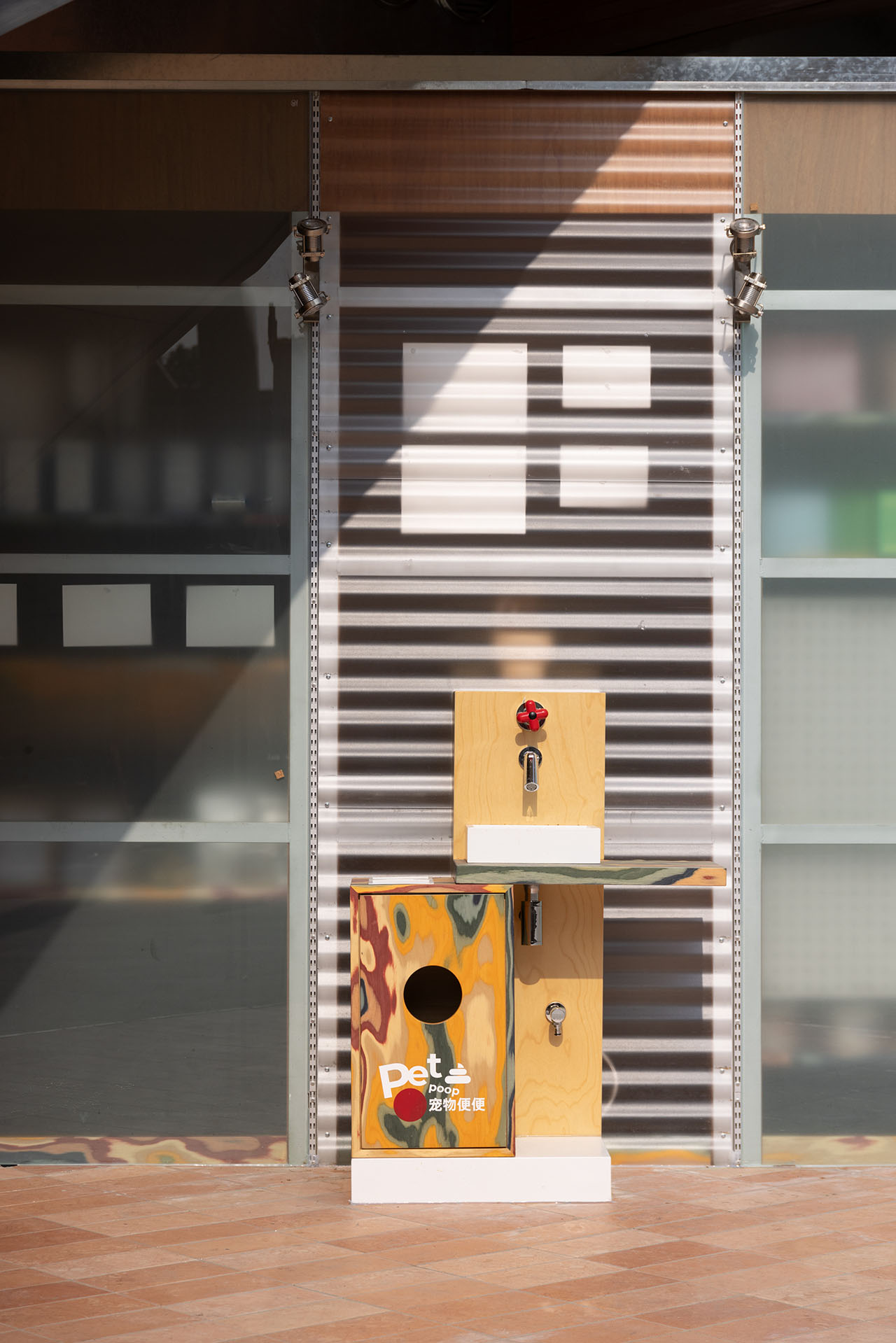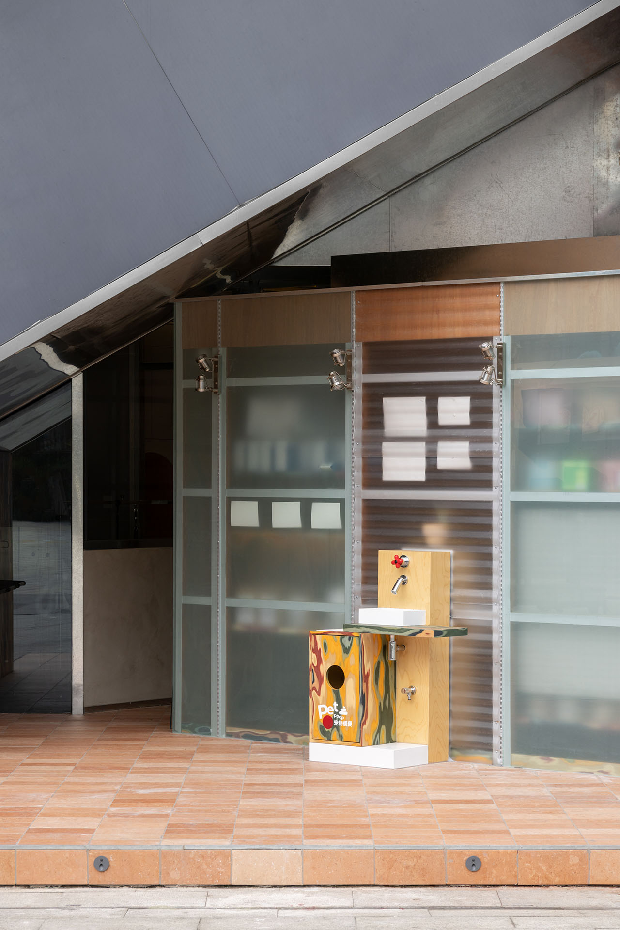 建构的方盒子,有着四个立面、且立面的里侧和外侧均可使用,作为宠物零售区再合适不过,最里侧的区域则留给宠物洗护SPA。