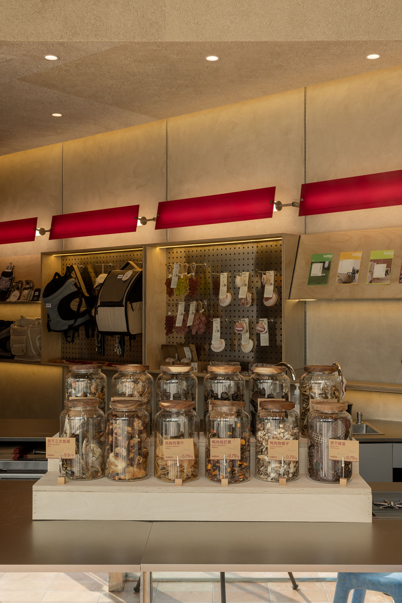 解决了设计之初的两个主要问题,三个功能区的划分便已十分清晰。连接主入口的区域,有着通透的玻璃幕墙,适宜将人宠社交、下午茶休闲时光放置在这里,释放室内场景,吸引过往路人。