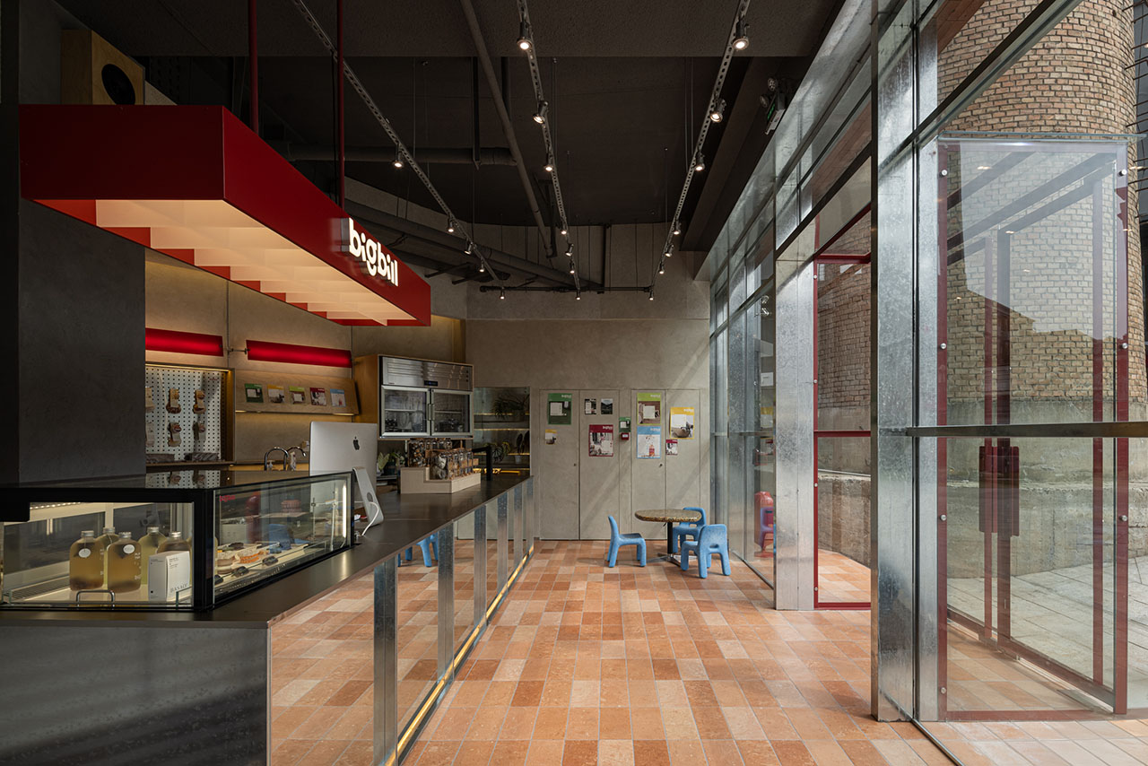 呼应红砖砌筑的烟囱,在外立面的设计上,选择陶土红砖拼装出门头,外延的地台则使用磨砂面红砖铺装,通过材质的协调,建筑空间与烟囱之间,消解了原本的割裂感和压迫感,产生“亲近”的链接。