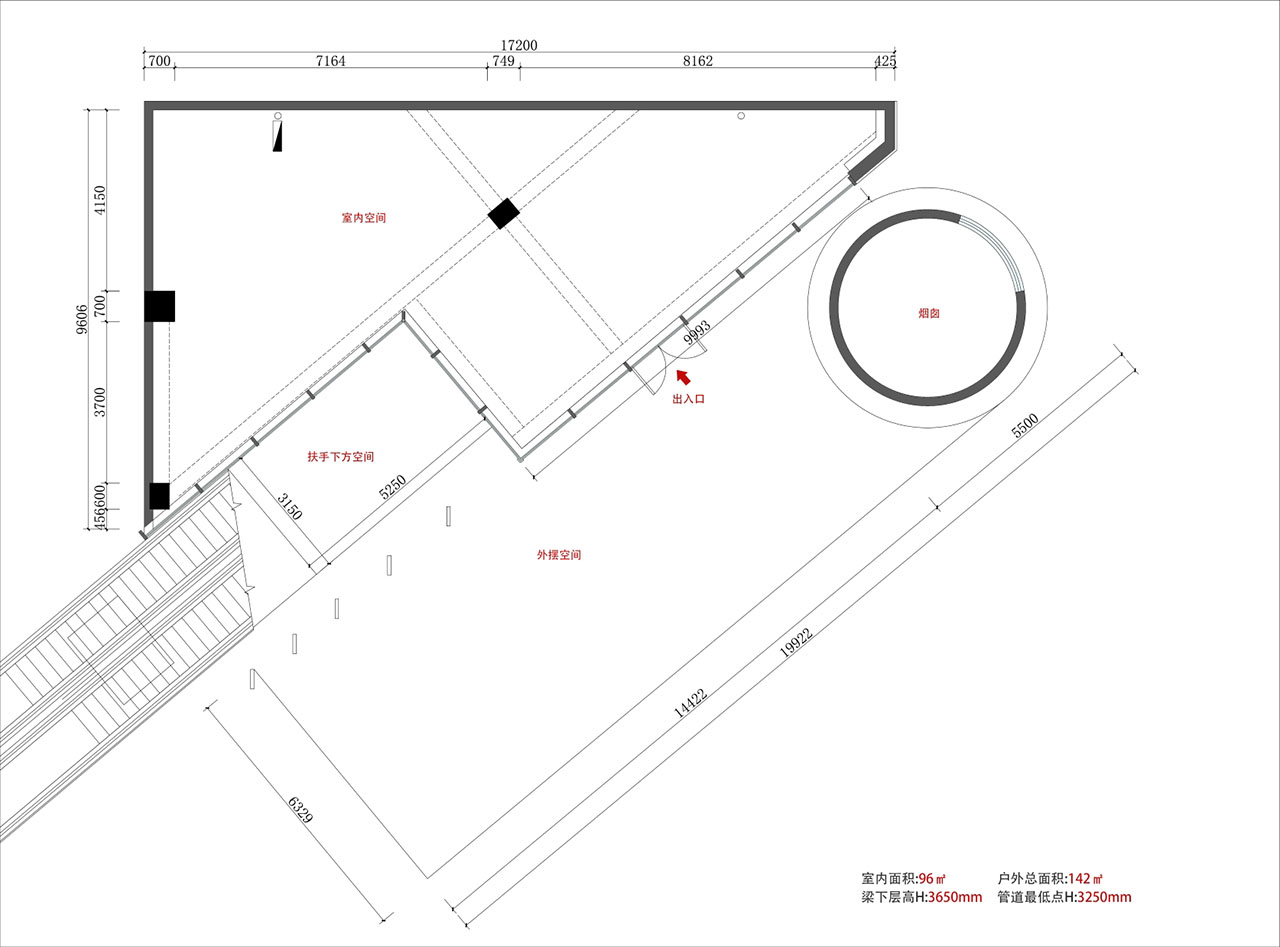 勘测场地后,我们发现项目所在场地主要存在两个问题:红砖烟囱虽然极具标识性,但与项目基地过近,产生逼仄、压迫感;原始场地呈三角形,又因其一侧的扶梯,形成一个有矩形缺口的三角形空间,这也是铺面长期被闲置的原因。