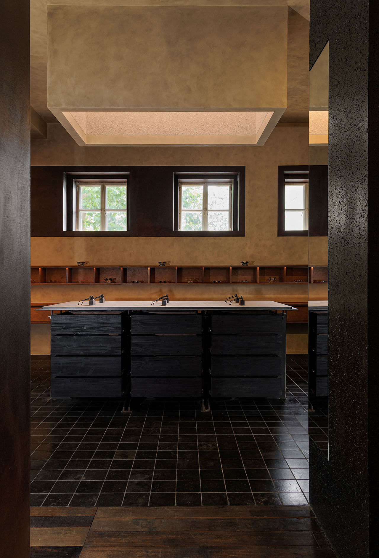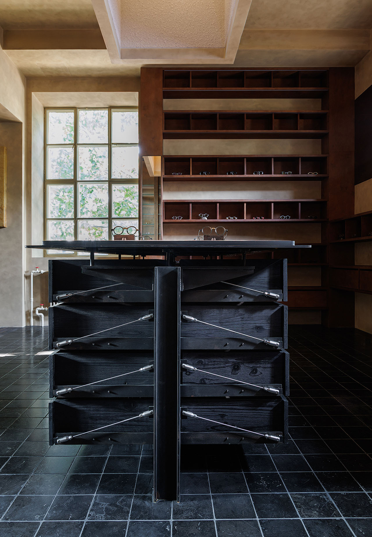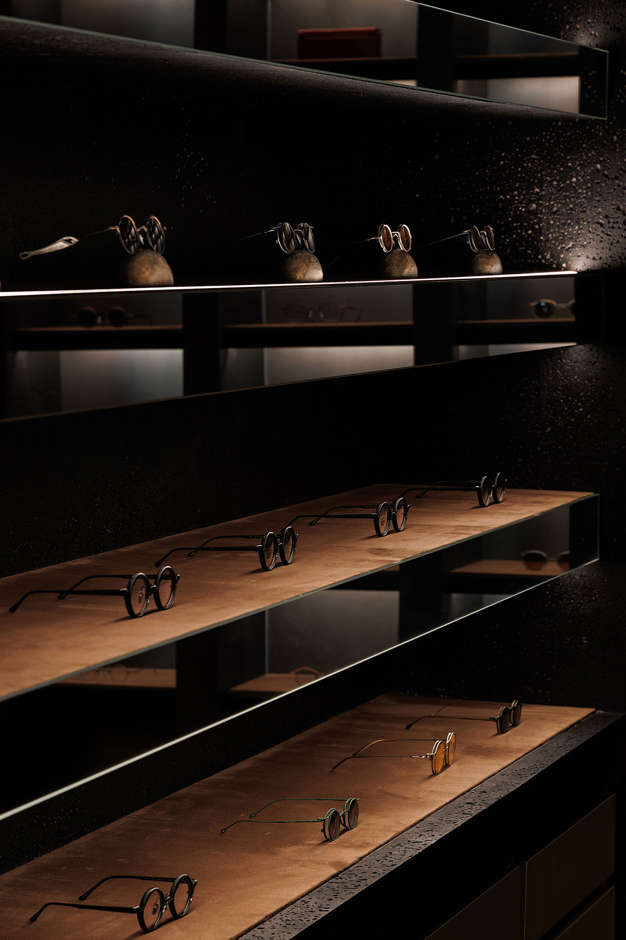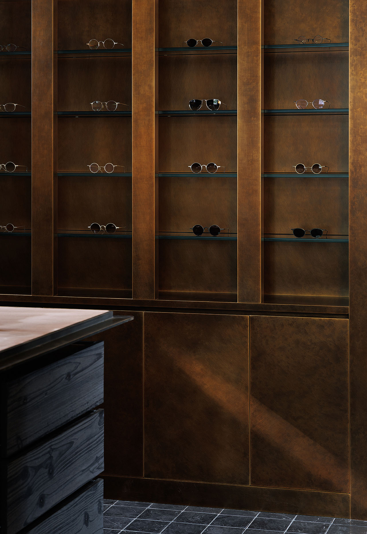 光成为空间中最具流动性的材质。自然光透过钢窗洒入,在室内空间映刻出随时间变化的光影戏剧;定制灯光系统以精准的角度勾勒展陈区域,使每一副眼镜如同博物馆中的展品。铜板柜体在光照下折射出暖调微光,桦木材质在漫射光中凸显温润质感——光不仅满足功能需求,更成为划分空间情绪的工具,在冷峻与柔寂之间建立平衡。