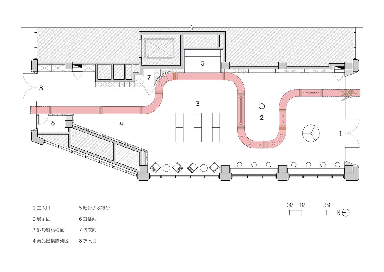 针对狭长的场地形态,我们借鉴了中式园林“步移景异”的营造逻辑,以“红色能量带”设定蜿蜒的游览路径,引导顾客在探索中收获层层递进的感官体验。