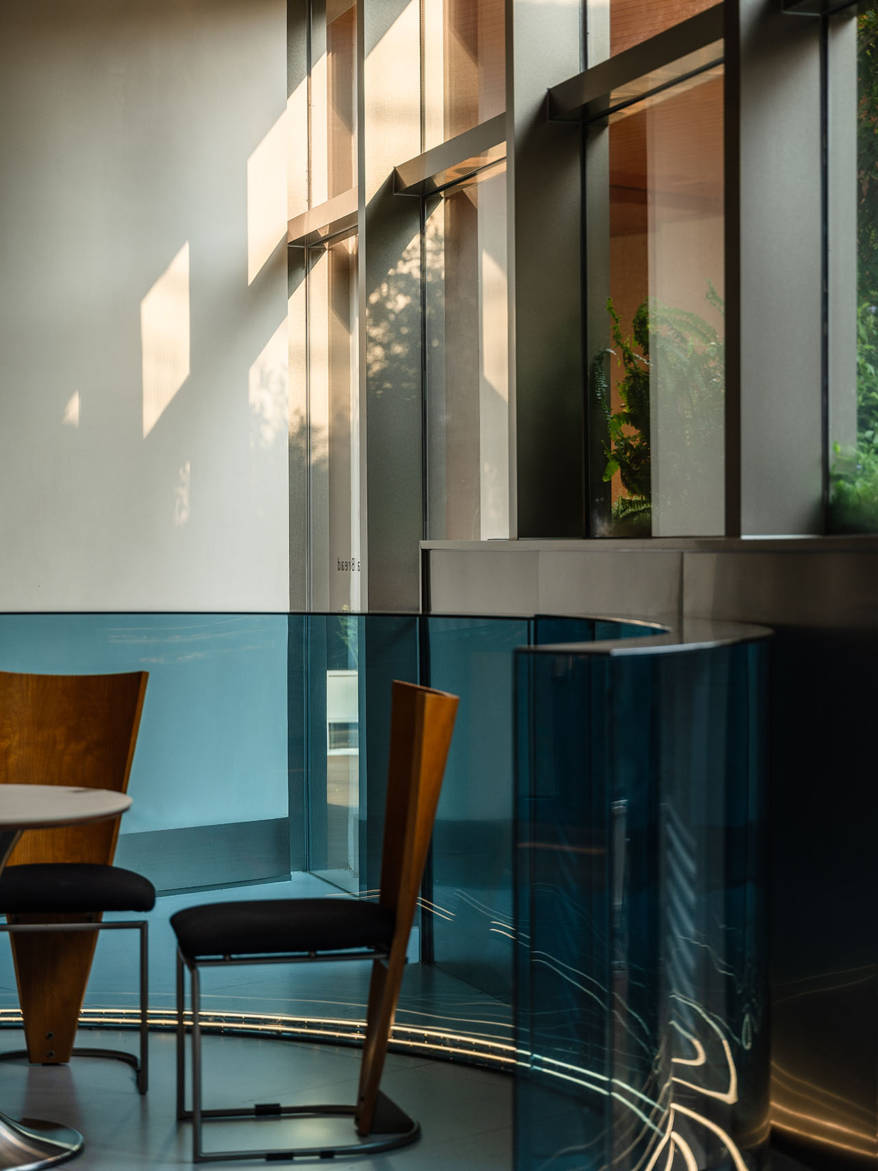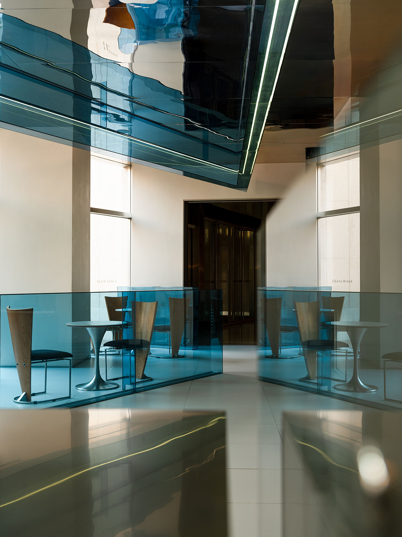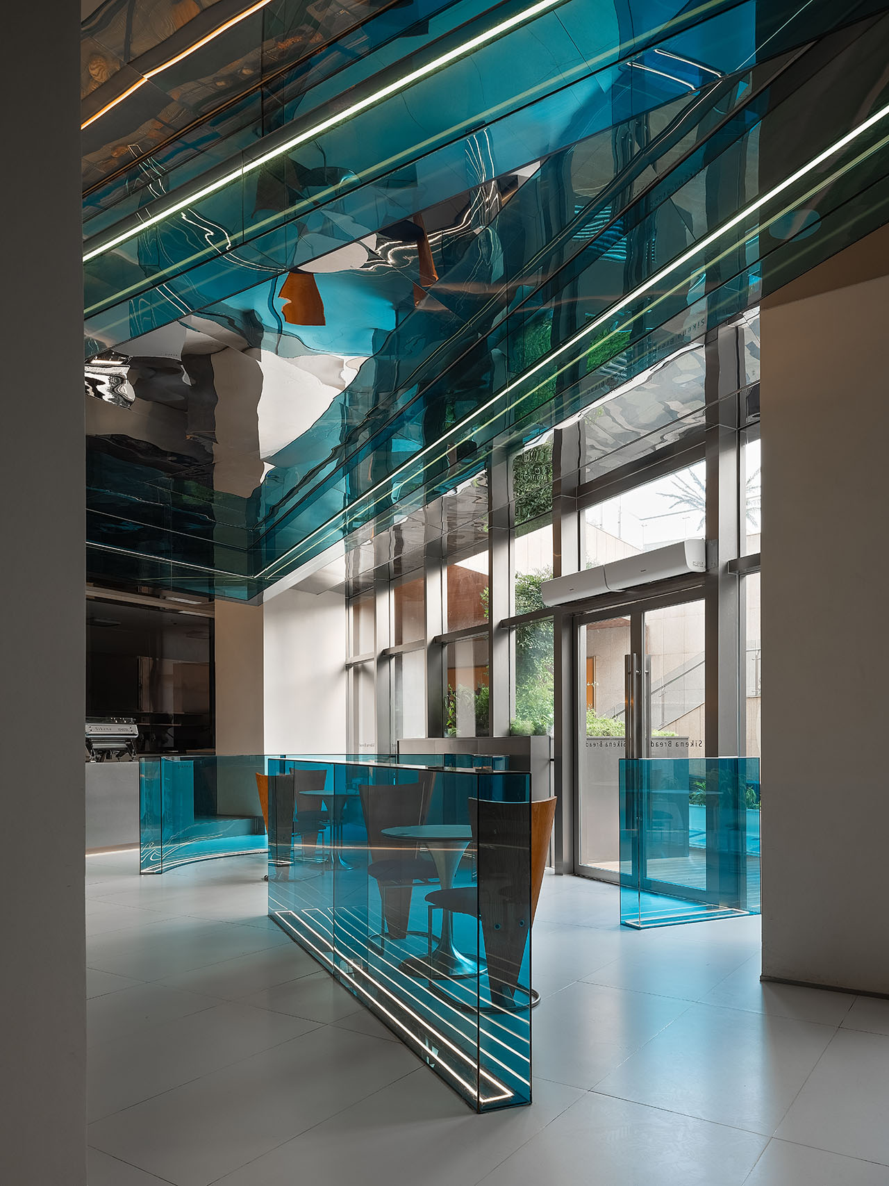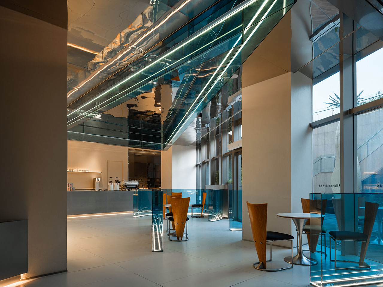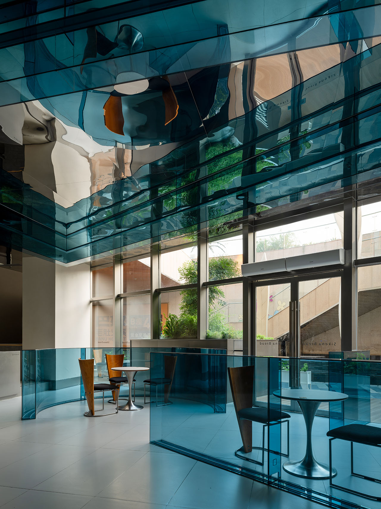 将镜面材质插入公区顶面,向上无限延伸几何形态与环境细节,瞬间放大了空间的纵深感。光影在镜面与空间之间交织出多重反射,让客座区悬浮起来,窗外绿意则透过玻璃闯入,映在镜面中,与室内的蓝调、橙调共述生命力。