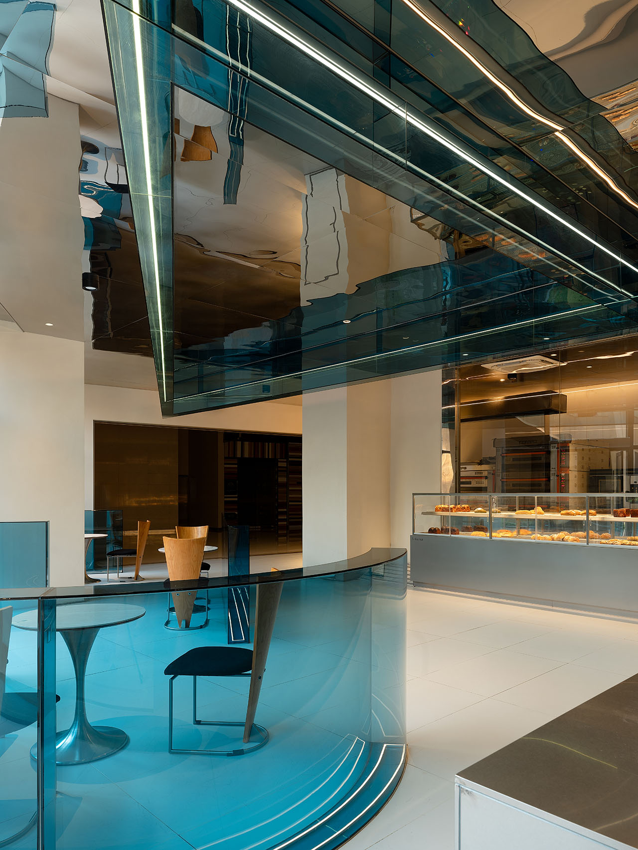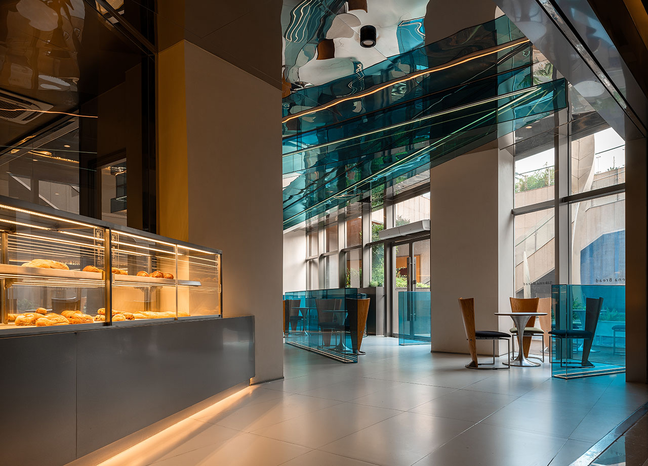 延续空间架构的倾斜动势,构建斜置面包展示柜,创造出敞阔且包容的入口形象。玻璃界面与暖光配合,将面包的纹理与色泽直接呈现到顾客眼前,带动视线与专注力跟随斜置结构自然流动,让选购过程成为一场沉浸式的视觉漫游。