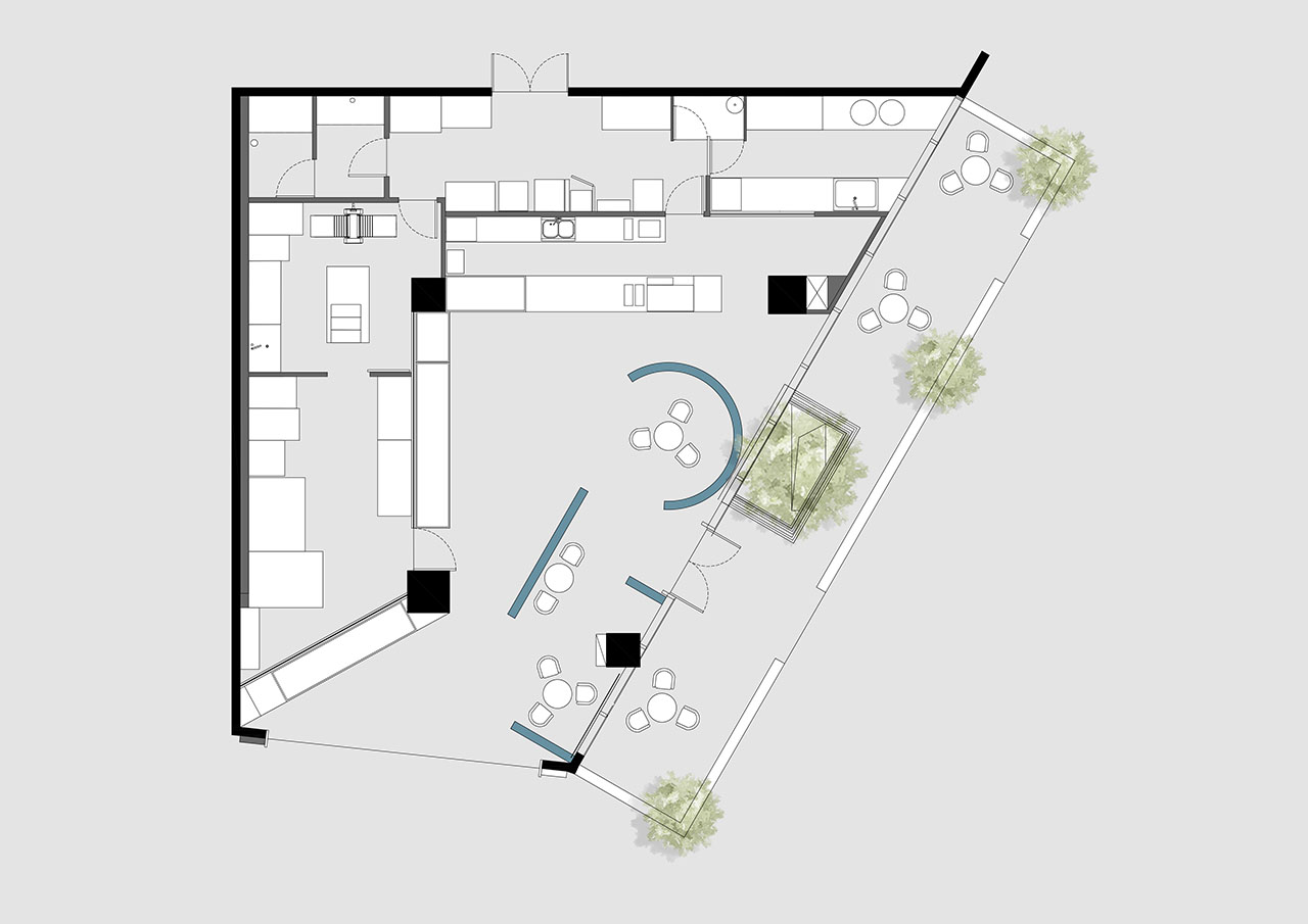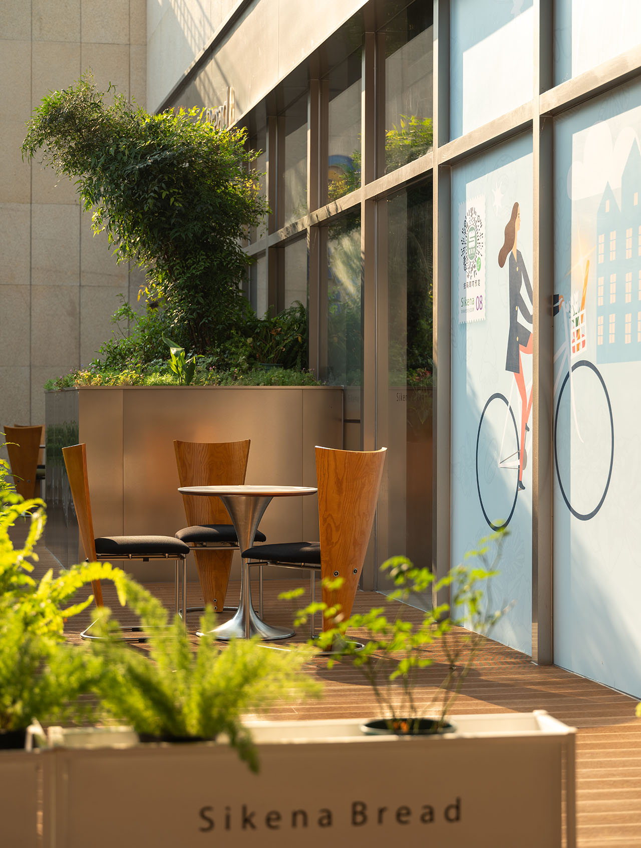 根植建筑斜面特点,于室外设客座区。先用简约线条勾勒种植区的占地轮廓,划分室内、室外客座区与街道的界限。再铺设原木色地板,为就餐场景烘托暖感,加深顾客对面包的多维印象。阳光透过绿叶洒在桌面,面包浓香随风散开,和鸣着日出的宁静。