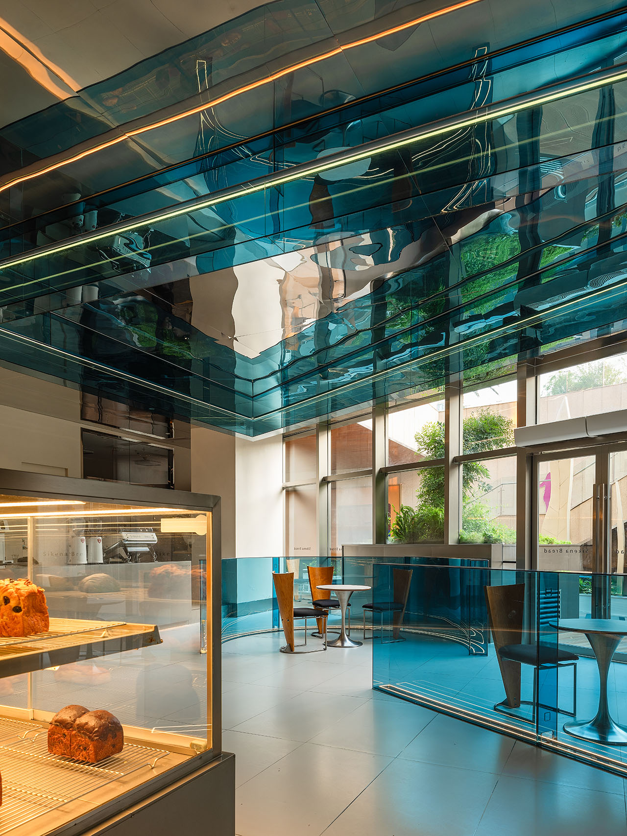 Sikena Bread的空间配色与氛围,从莫奈的《日出·印象》中汲取灵感,借画中的太阳暖橙凸显工作区与面包展示区,以海天之蓝强调室内客座区的独立性。