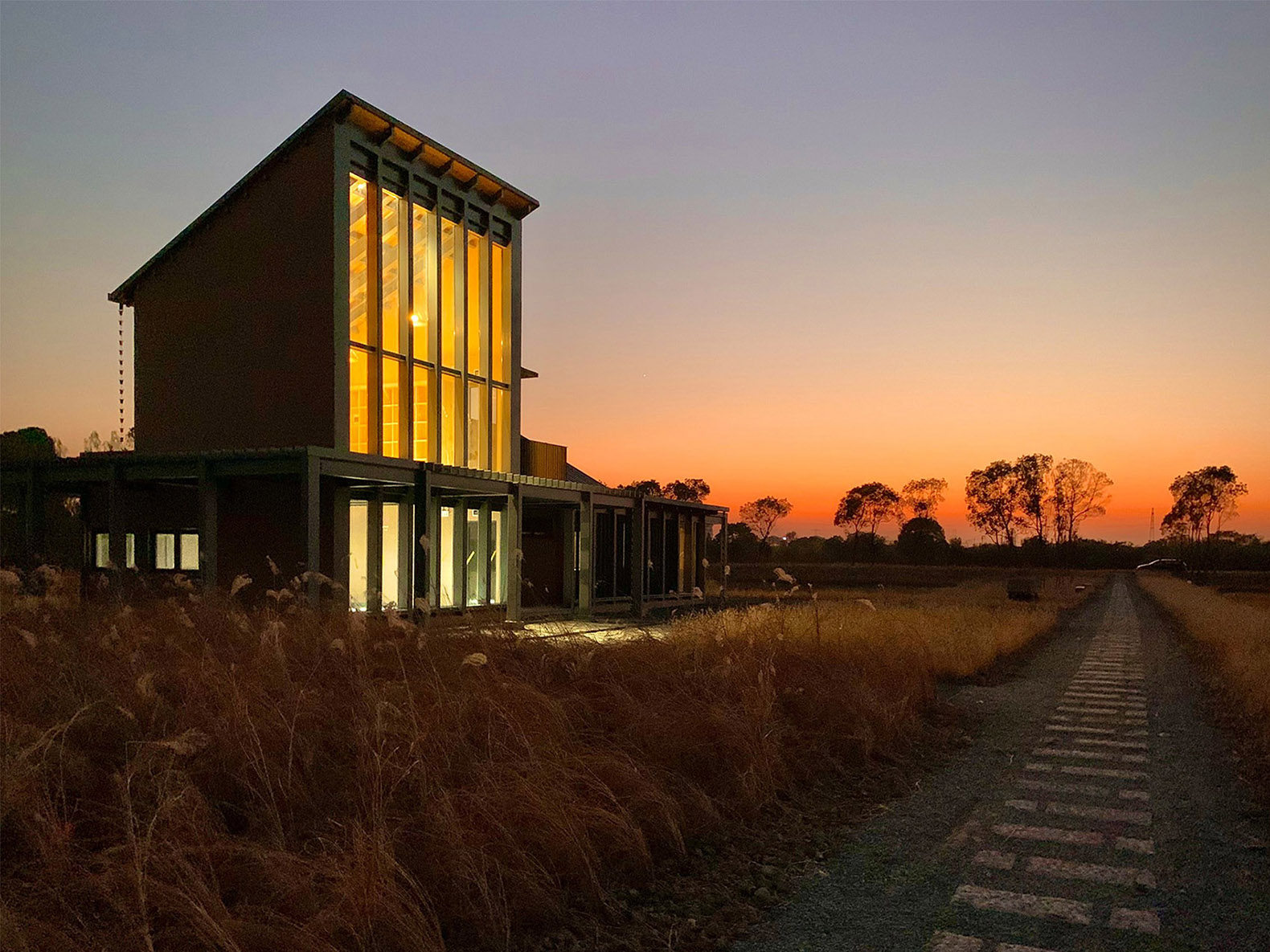 傍晚时分对岸观望,稻田的金黄也没有白天时分那样闪耀。此时,微黄的灯光从建筑内部一点点渗透出来,晕染开来,也削弱了原本带有尖锐感的模样。周围的一切都沉静下来了,此时的书局就像是一个稻田里的守望者,它守望着水乡孕育的人儿,守望着眼前这片在四季年轮里和人一同生长的稻田。