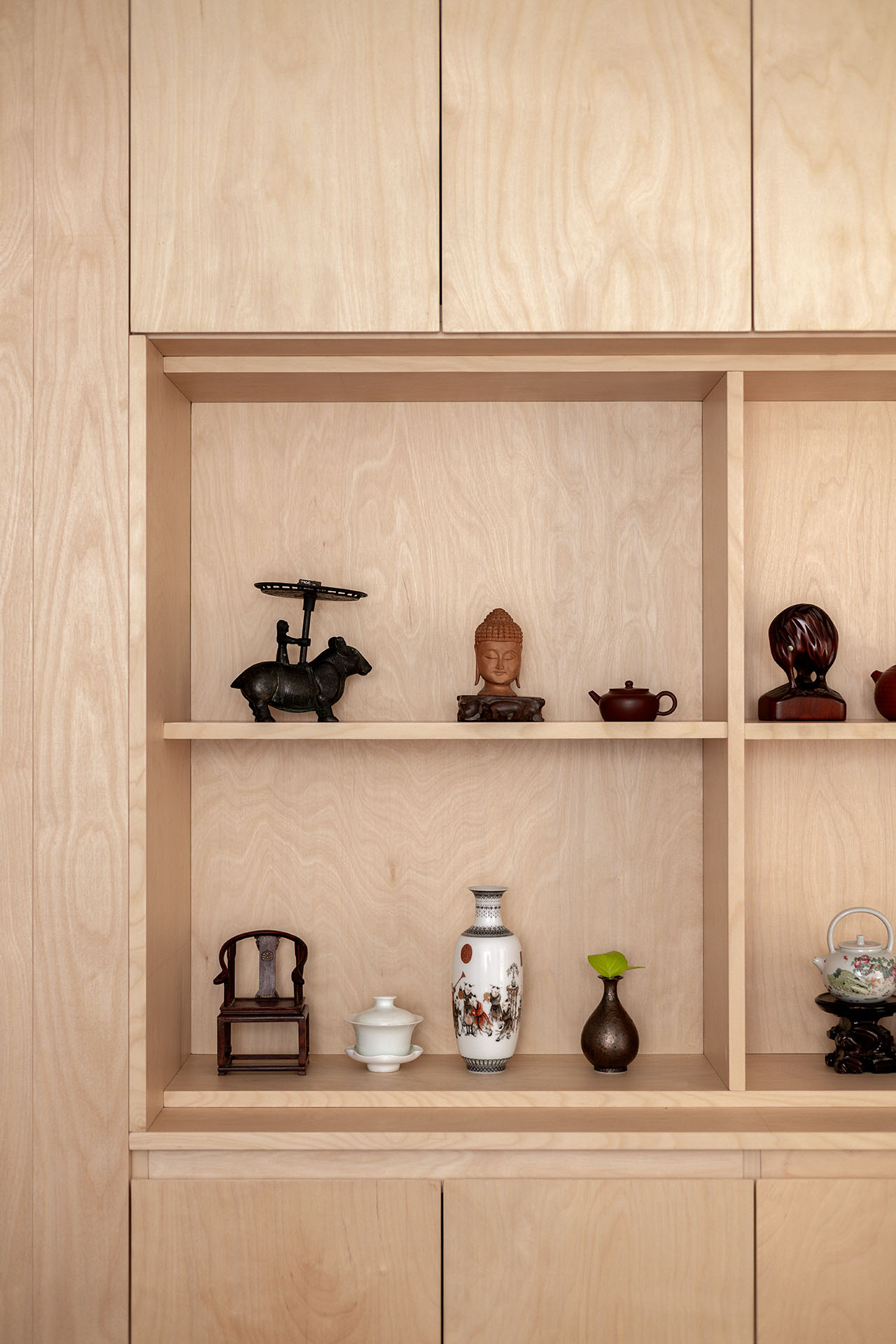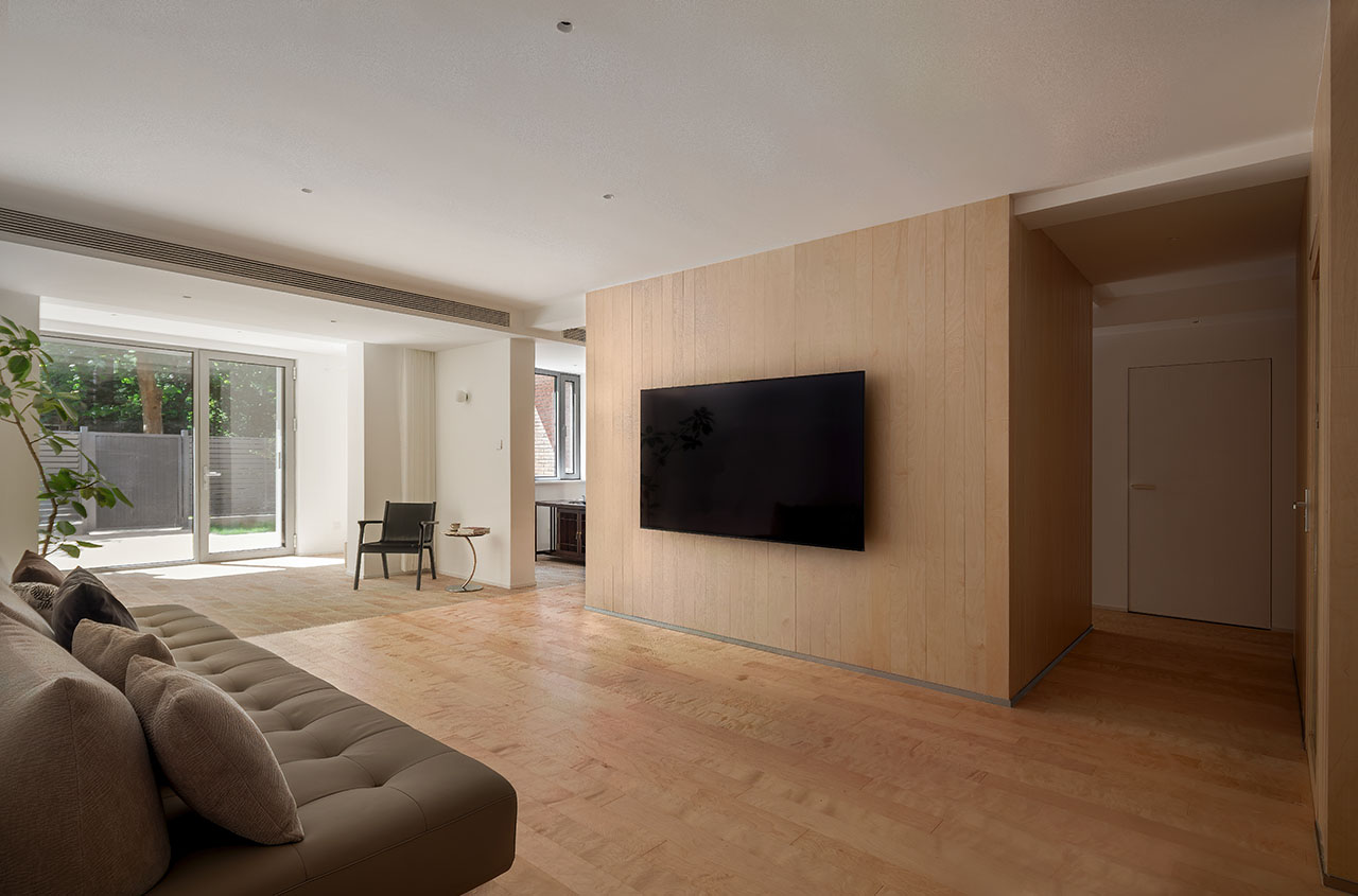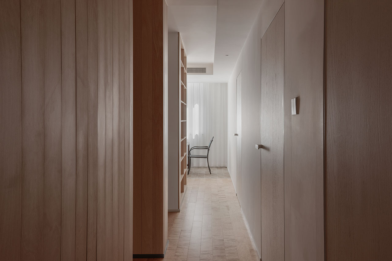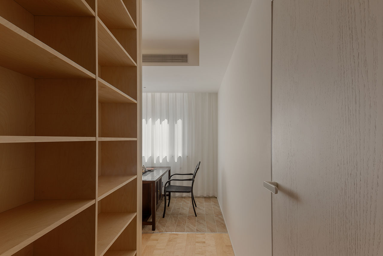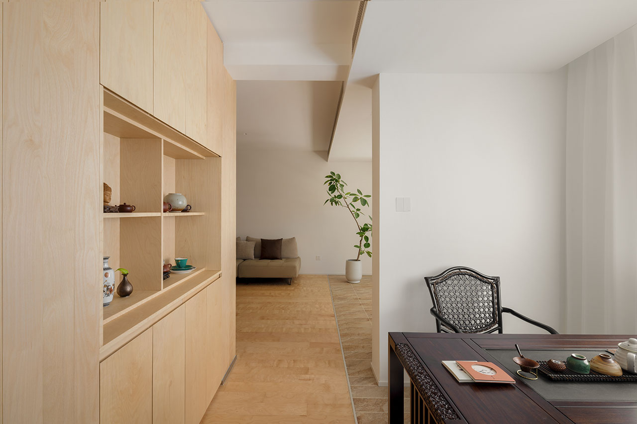 制造“边界错动”效果的铺装石材延伸进入小玄关、客厅、品茶空间以及卧室的一部分,在功能与心理层面上都带来了空间的扩展。同时,在同一空间内让木地板与石材并置共存,也为生活方式和空间使用方式提供了更多可能性。