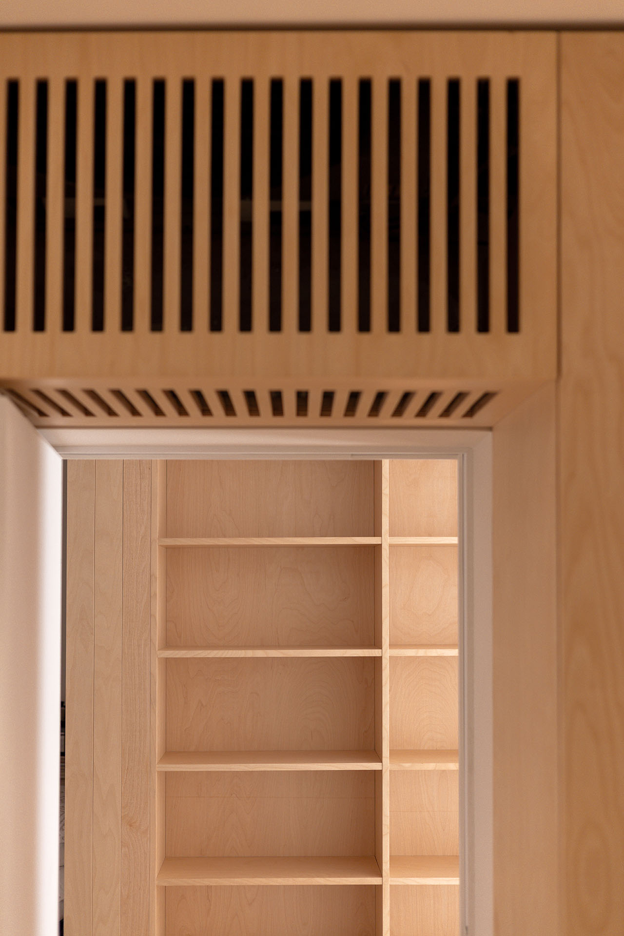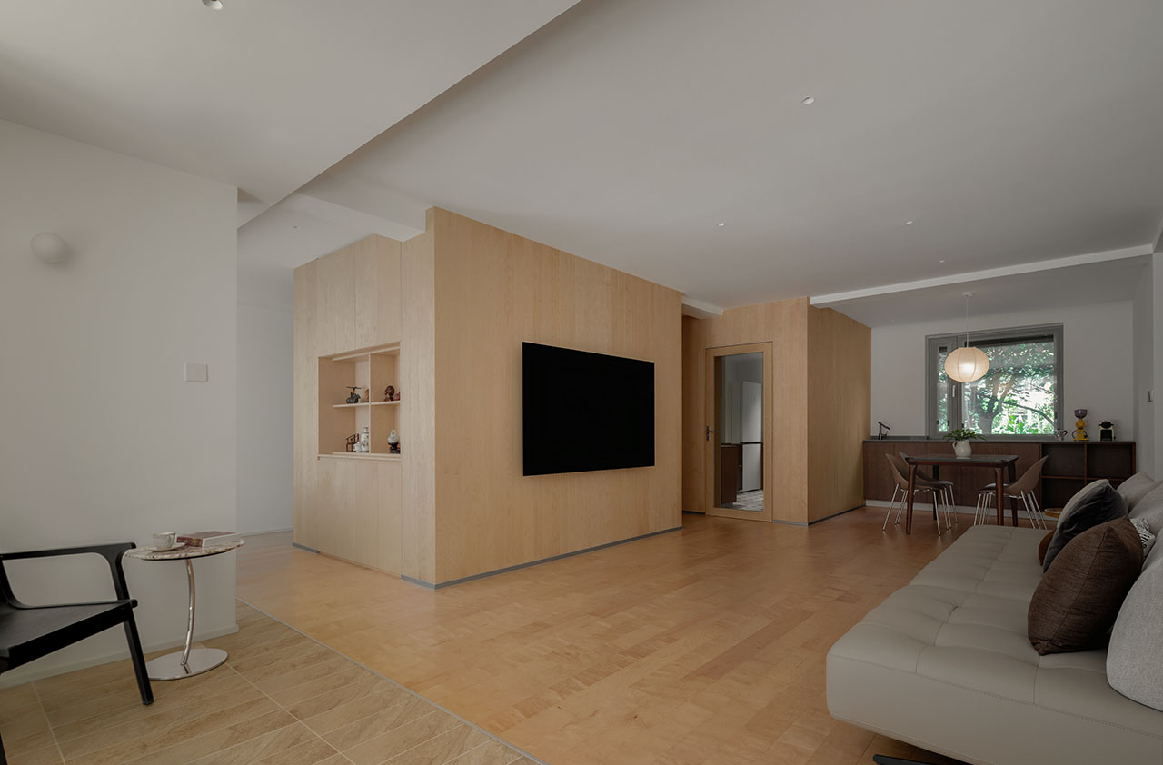 在平面上处于“未对齐”关系的客厅回游核心墙体与厨房墙体,采用了同样的桦木材料加以统一。而围绕它们的其他墙面则全部以白色处理。通过这种对比手法,营造出一种仿佛两座桦木“小屋”在空间中轻微“错位”而立的不整齐美感。