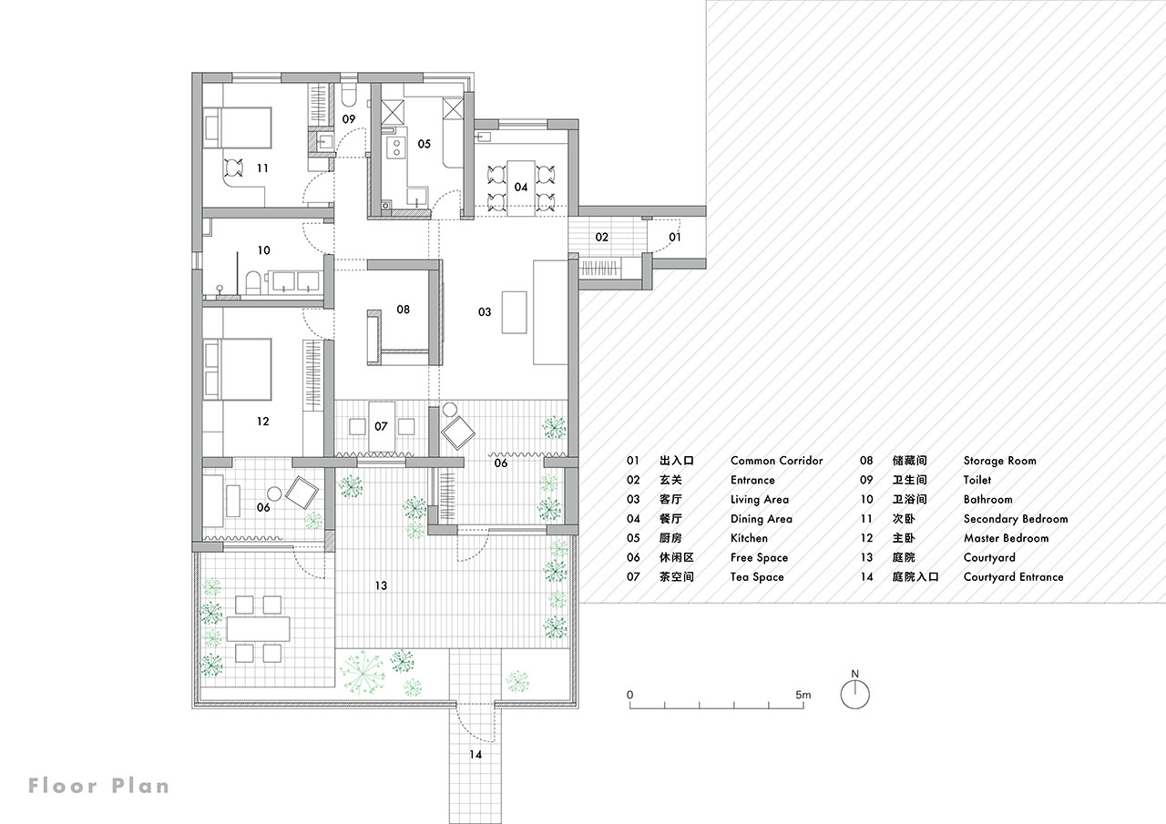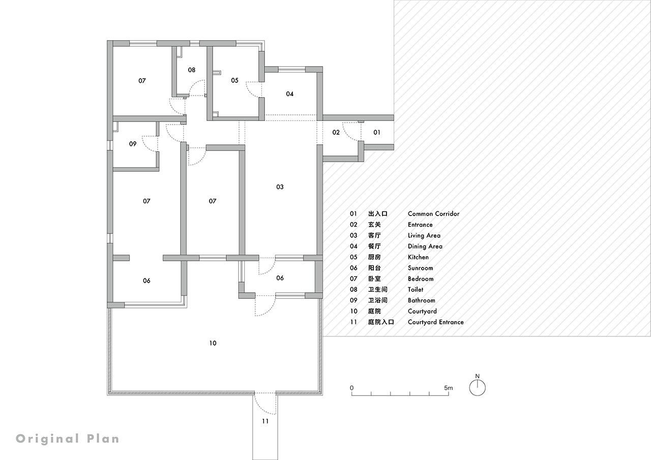 位于北京郊区,是一处室内面积约153平方米的公寓改造。居住者是一对夫妻和两只猫,位于地上一层,并拥有约60平方米的室外院子。