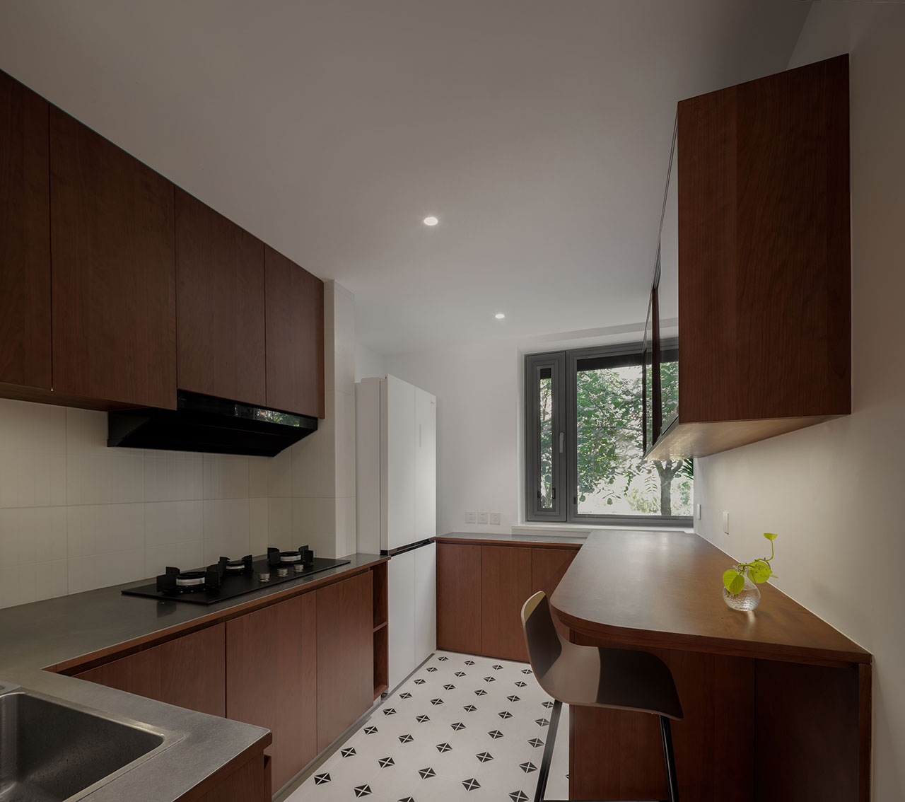 以焕新的客厅作为空间核心,餐厅、厨房、两间卧室、品茶空间以及室内的小庭院都沿着回游动线自然展开,构成了一个流动、开放而又富有层次的整体布局。