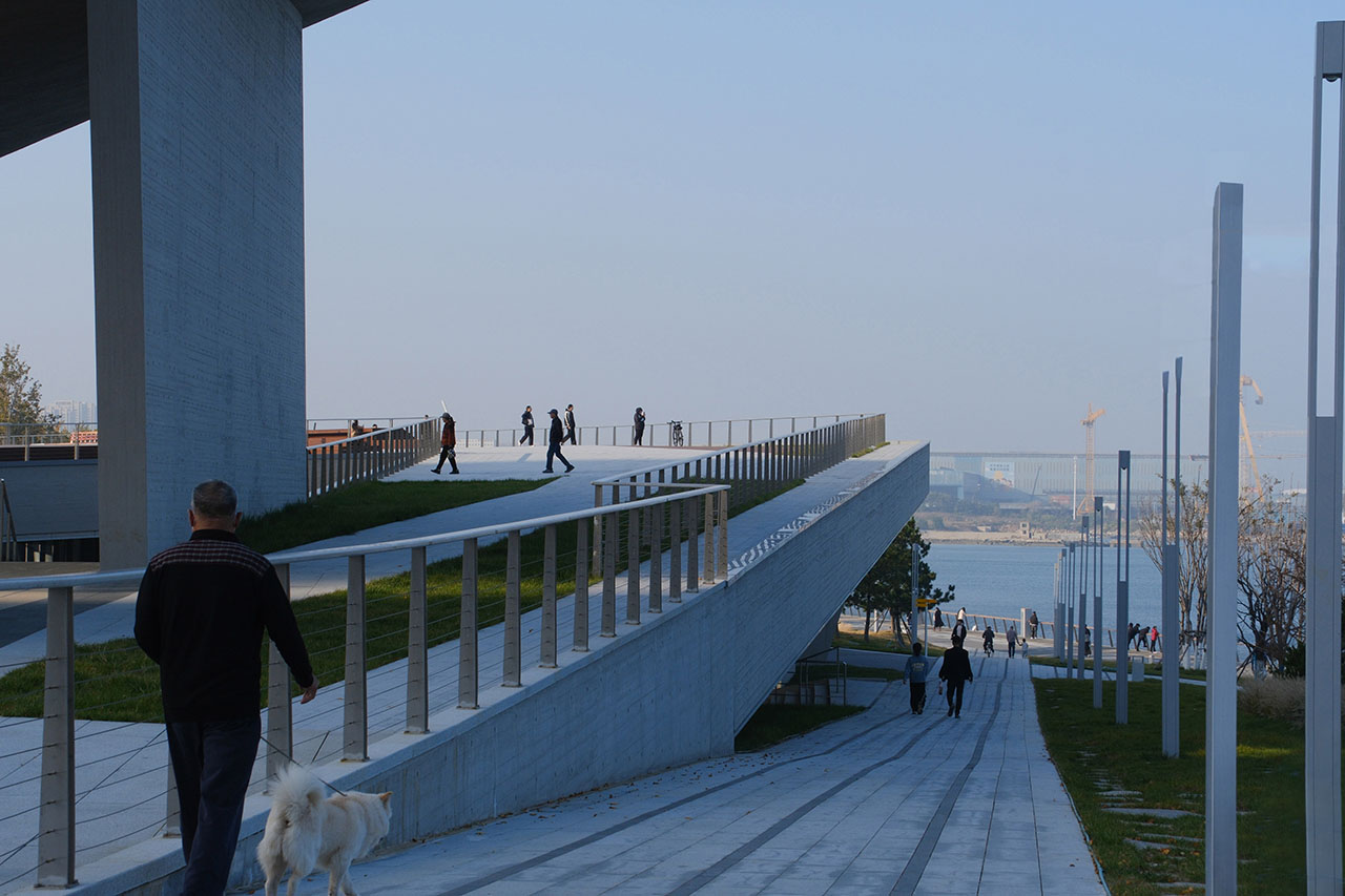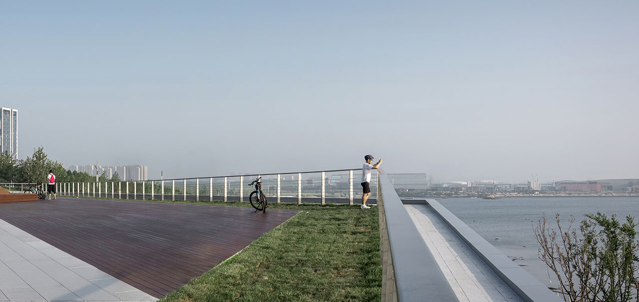 滨海沿线日常活跃着骑行、运动、休闲的市民,却长期缺乏与之匹配的休憩与服务节点。“一道地平线”通过环境、空间的多重维度,创造人与大海接触的机会,塑造共享、开放、活跃的城市阳台,也是公共建筑对市民社会最深刻的回应。